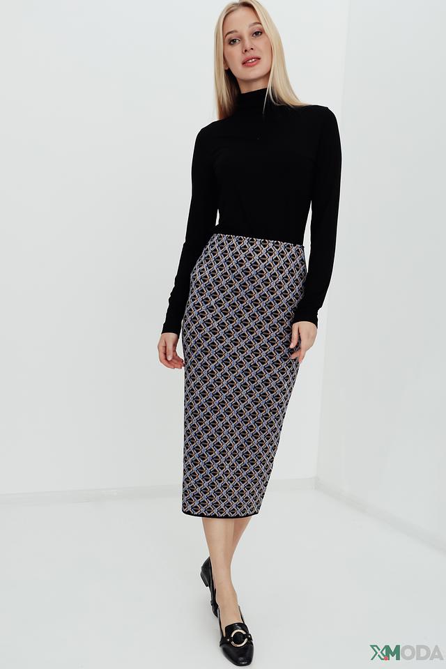 Модель имеет приталенный силуэт и длину миди, что делает ее универсальной для различных случаев. Юбка выполнена из приятной на ощупь ткани, состоящей из вискозы, полиэстера и полиамида, обеспечивающей комфорт при носке.