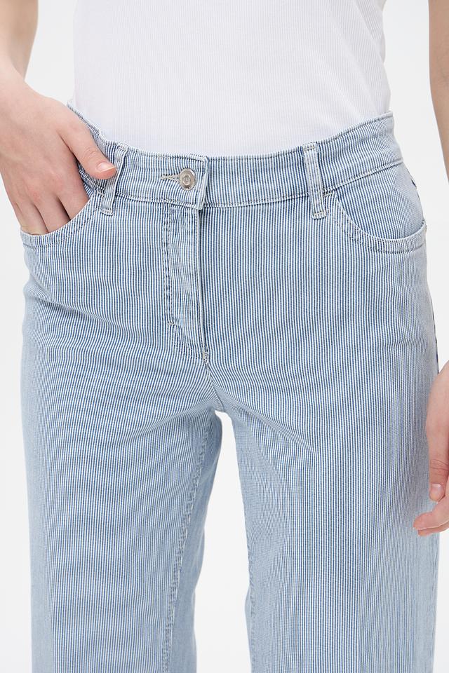 Капри имеют классическую посадку по талии, пять карманов (два передних, два задних и один монетник) и укороченный крой, что делает их идеальным выбором для теплых дней. Вертикальная полоска визуально вытягивает силуэт и добавляет образу свежести.