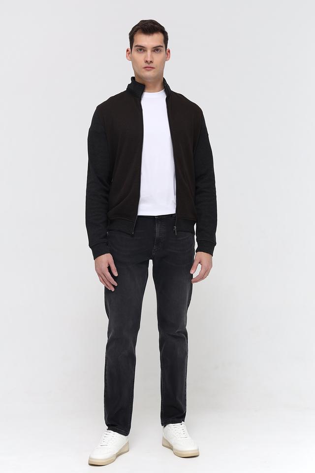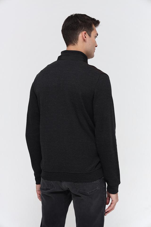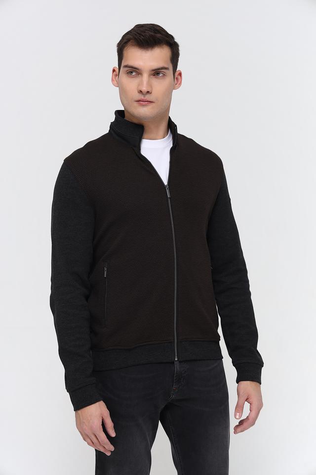 Мужской кардиган Bugatti чёрного цвета с контрастными деталями и застёжкой на молнию. Изготовлен из фактурного трикотажа, имеет воротник-стойку и удобные боковые карманы. Состав: хлопок 100%