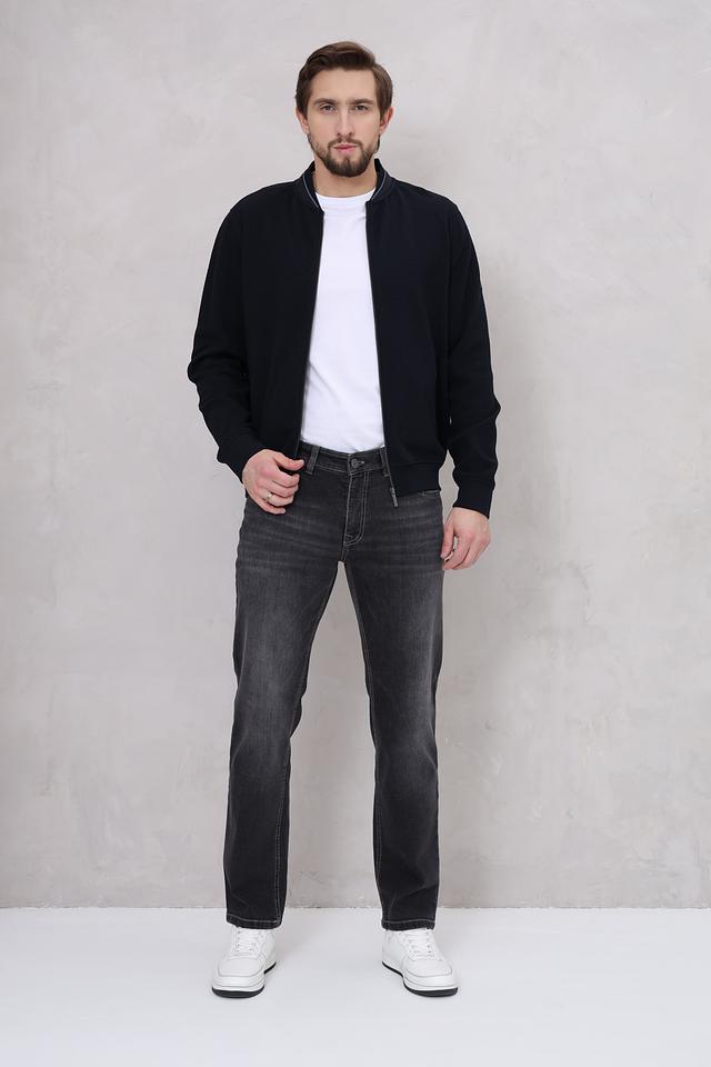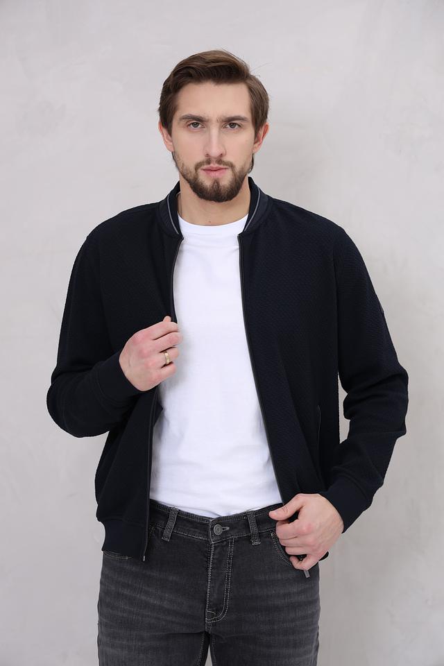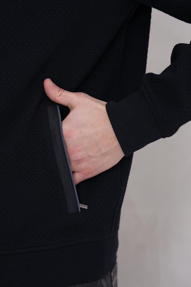 Кардиган имеет удобную застёжку на молнии, воротник-стойку с контрастной полосой и манжеты в рубчик. Текстура ткани с мелким геометрическим рисунком придает изделию особый шарм.