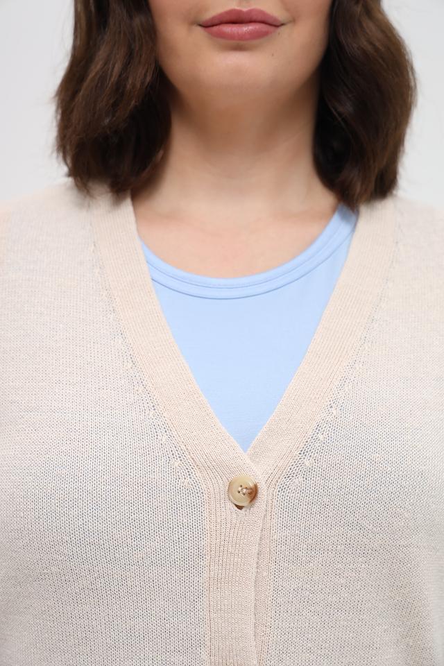 Кардиган изготовлен из высококачественного льна (67%) и вискозы (33%), что делает его приятным к телу, дышащим и комфортным в носке. Текстура вязки добавляет изделию объём и визуальный интерес.