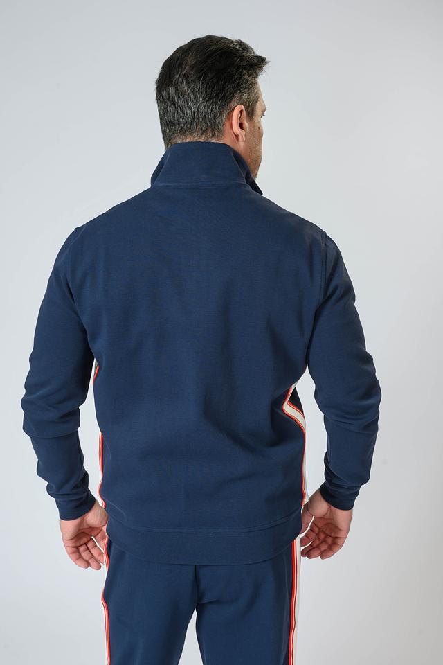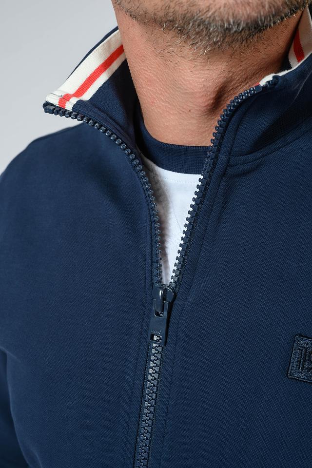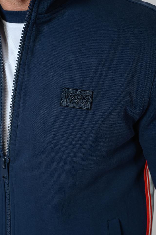Кардиган имеет удобный крой, обеспечивающий комфорт при носке. Декоративные полоски в красном и белом цветах на воротнике, рукавах и по бокам придают изделию спортивный и современный вид. На груди расположен небольшой логотип бренда 1995 года.