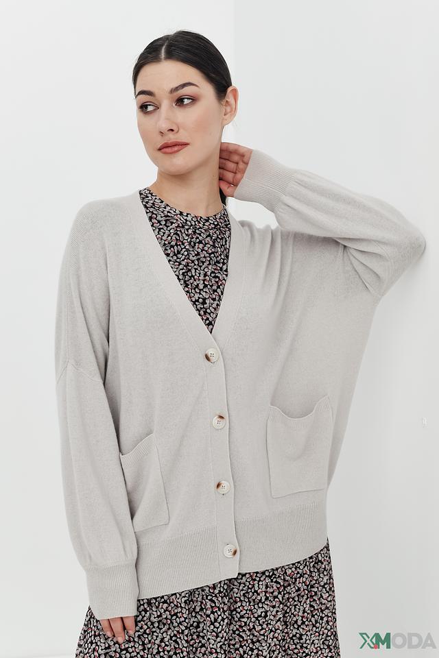 Модель имеет свободный крой, V-образный вырез и застегивается на пуговицы. Кардиган оснащен двумя удобными карманами. Длинные рукава с манжетами обеспечивают дополнительный комфорт.