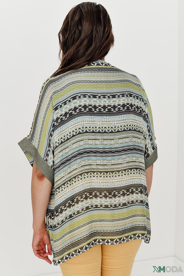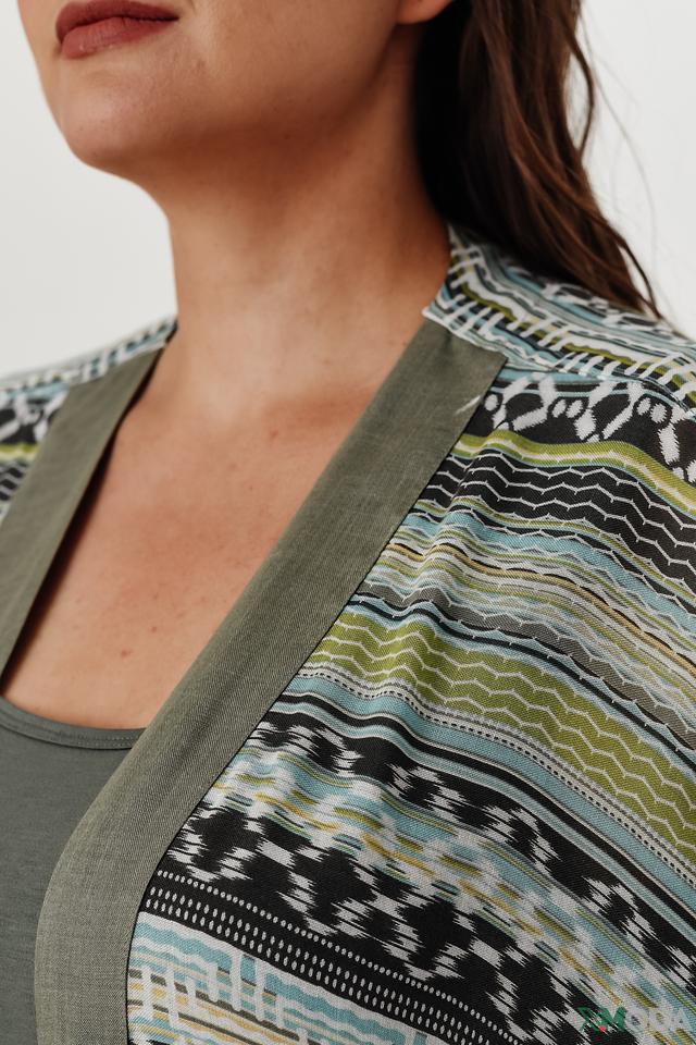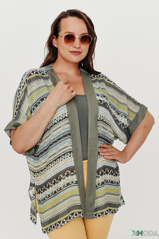 Кардиган имеет свободный крой, который не сковывает движения, и короткие рукава, что делает его подходящим для теплой погоды. Яркий геометрический принт добавляет оригинальности и позволяет выделиться из толпы.