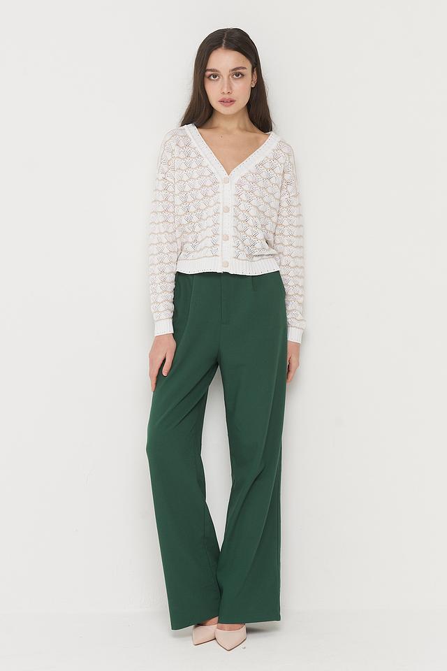 Кардиган имеет V-образный вырез и застегивается на пуговицы. Ажурный узор придает изделию изысканность и воздушность. Длинные рукава и слегка укороченный крой делают его универсальным для разных сезонов.