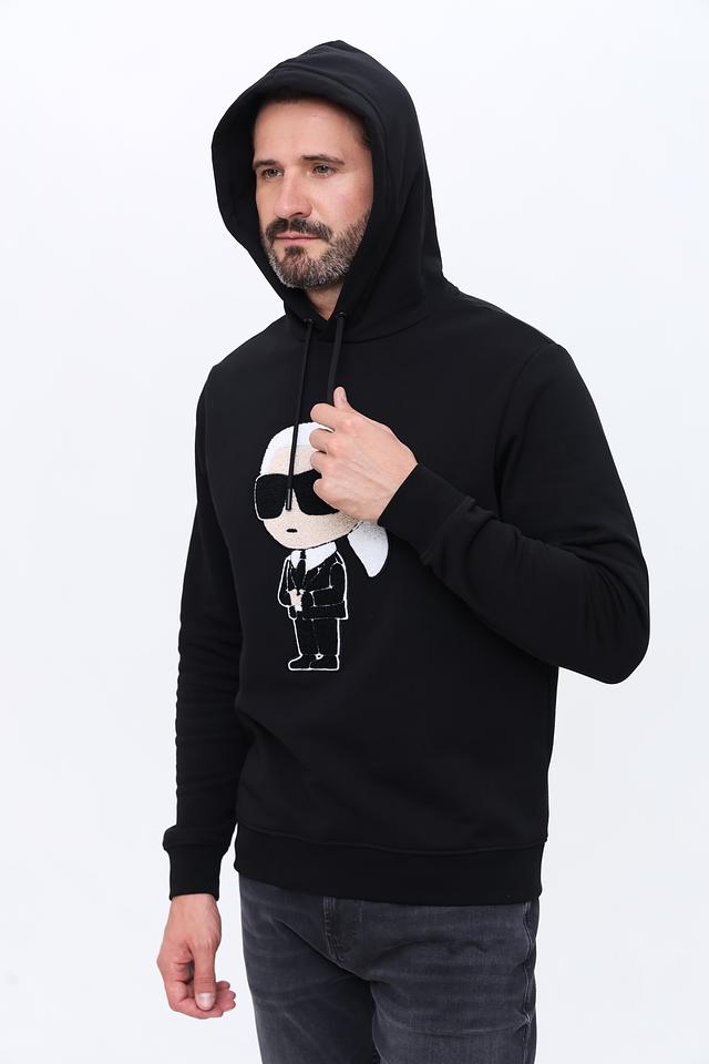 Основным акцентом толстовки является яркий принт на лицевой стороне, изображающий узнаваемый портрет Карла Лагерфельда в его фирменном стиле – в тёмных очках и строгом костюме. Принт выполнен в контрастных чёрно-белых тонах, что делает его особенно заметным.