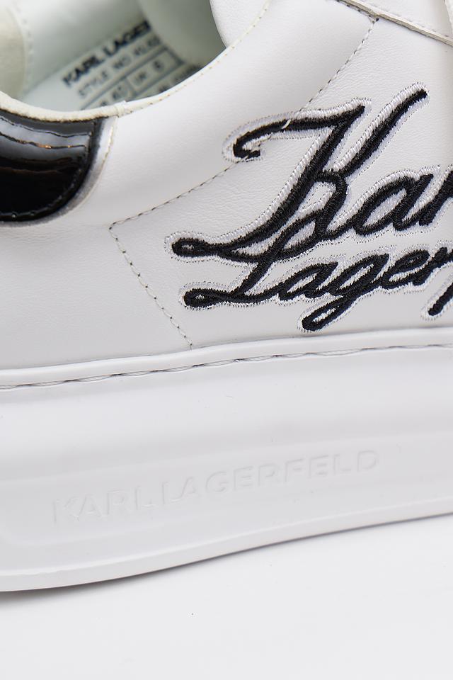 Верх кроссовок изготовлен из высококачественной кожи, что обеспечивает долговечность и комфорт при носке. Фирменный логотип Karl Lagerfeld, выполненный в черном цвете, эффектно выделяется на белом фоне, придавая обуви особый шарм.