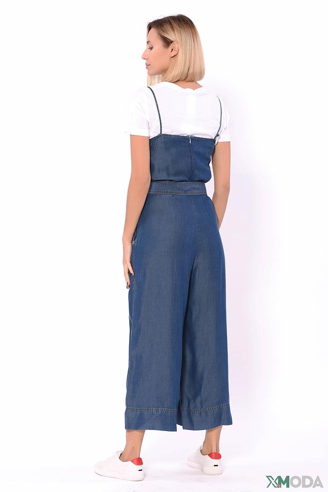 Комбинезон имеет классический крой с тонкими бретелями и свободными брючинами-кюлотами. Подчеркнуть талию и придать образу завершенность позволяет приталенный пояс. Застежка-молния расположена сбоку.