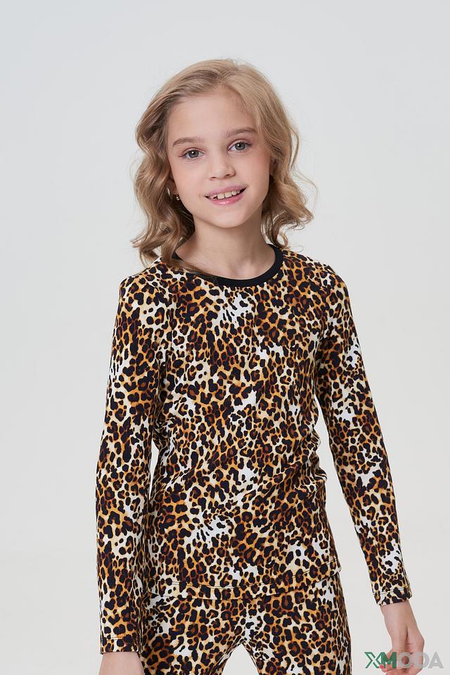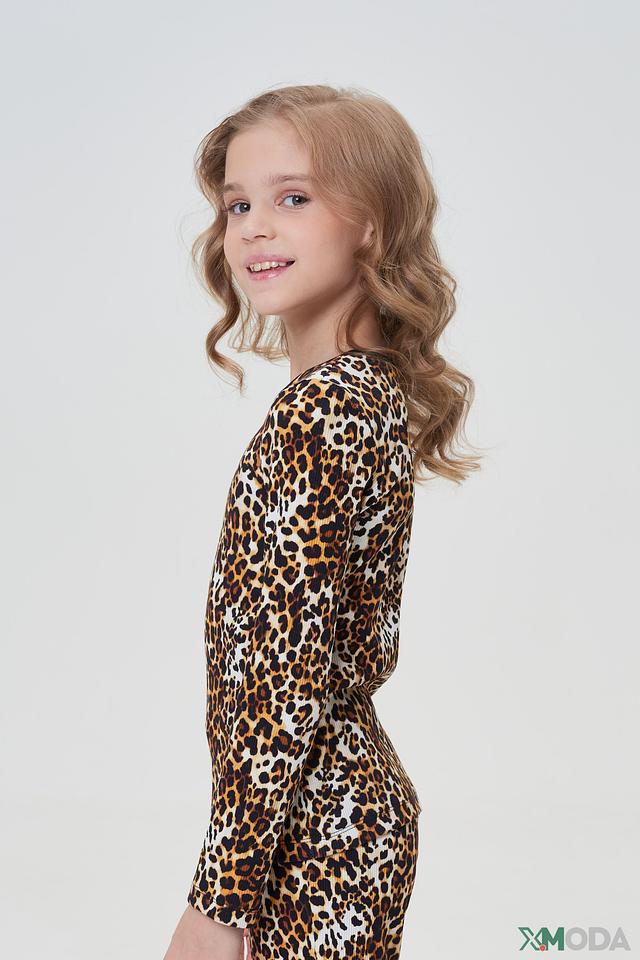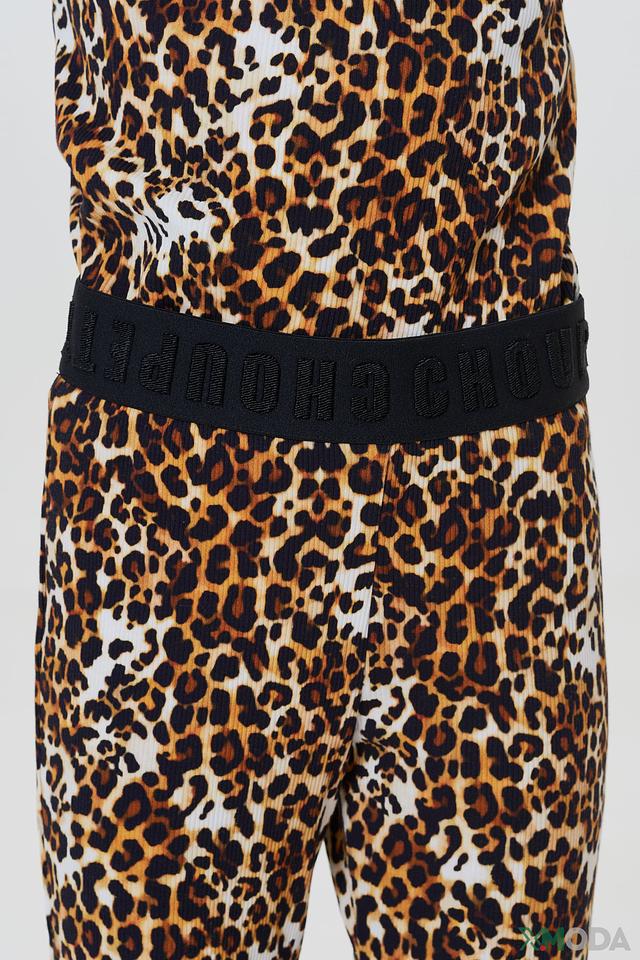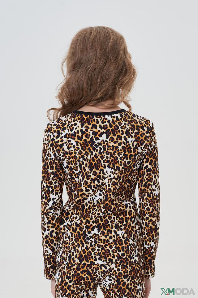 Кофта и брюки выполнены в ярком леопардовом принте, который добавит образу динамичности и игривости. Эластичный пояс брюк обеспечивает комфортную посадку. Кофта имеет круглый вырез горловины.