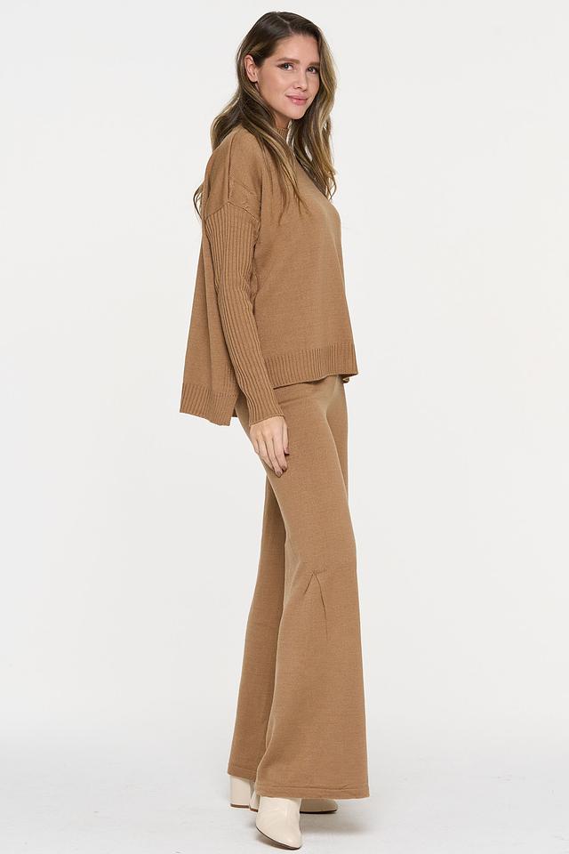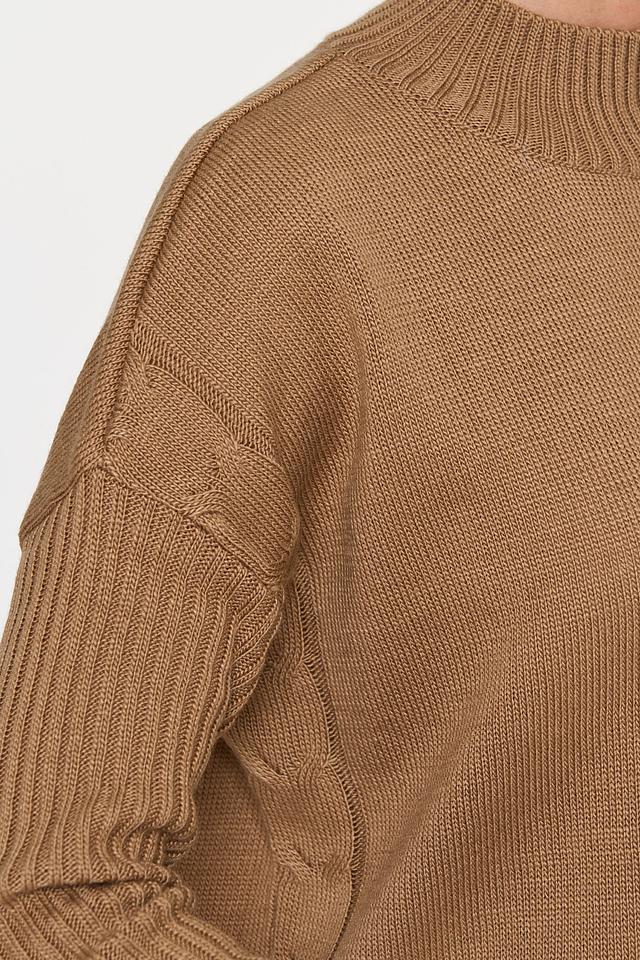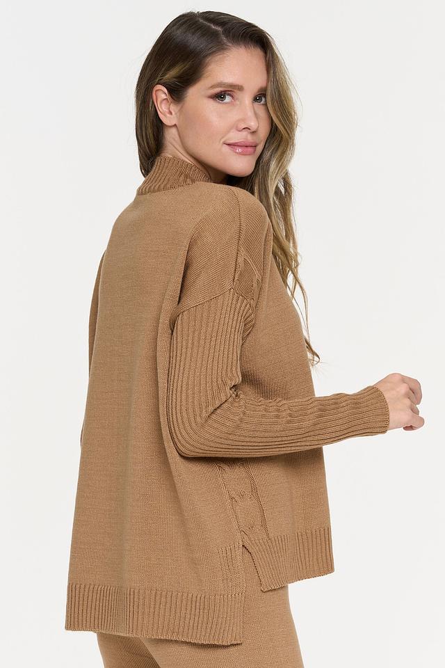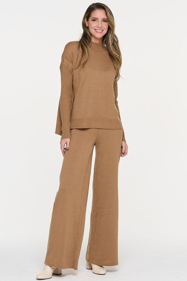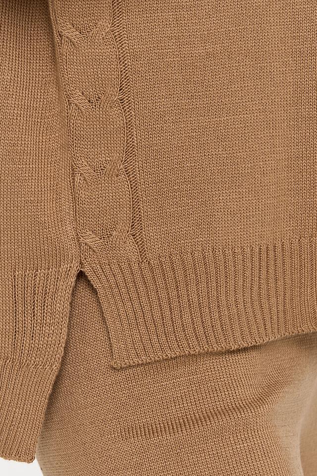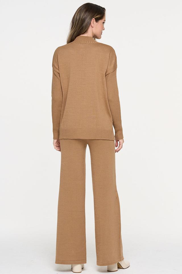 Свитер имеет высокий воротник, длинные рукава с манжетами, и слегка укороченный крой. На плечах и рукавах присутствует рельефный узор в виде кос, придающий изделию оригинальность. Брюки широкого кроя с эластичной талией обеспечивают максимальный комфорт в носке.