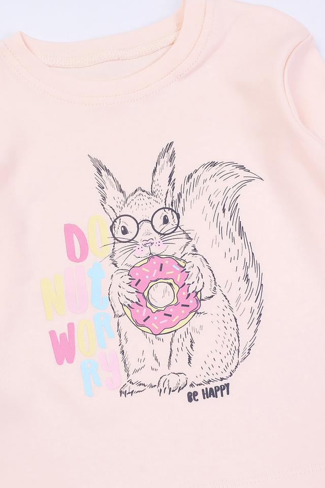 Эта милая футболка от бренда КотМарКот станет отличным дополнением к гардеробу вашей девочки. Футболка выполнена в нежном бежевом цвете и украшена забавным принтом с изображением белки, держащей пончик.