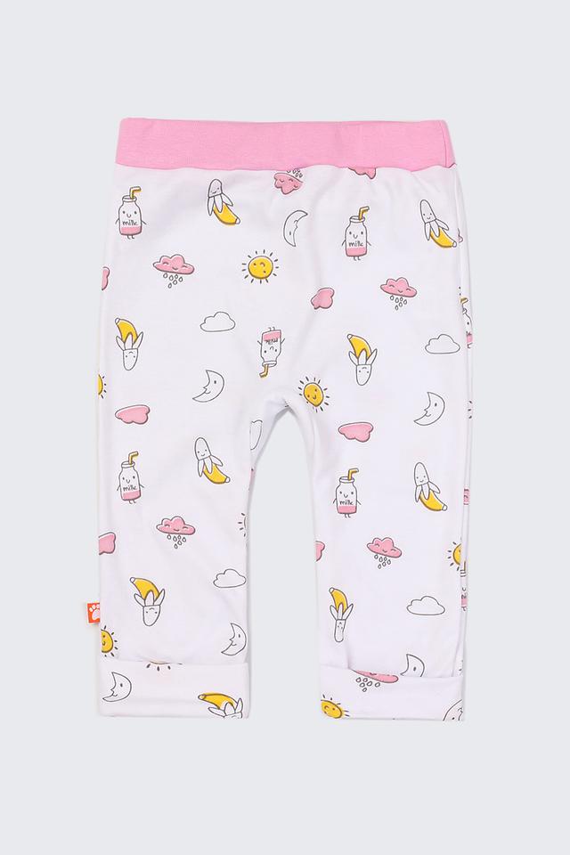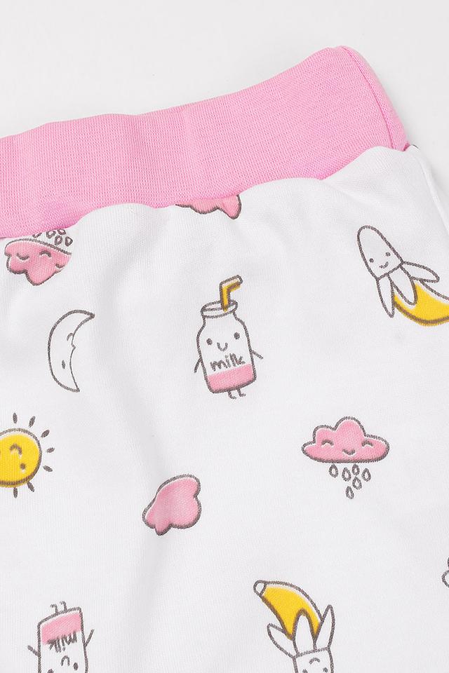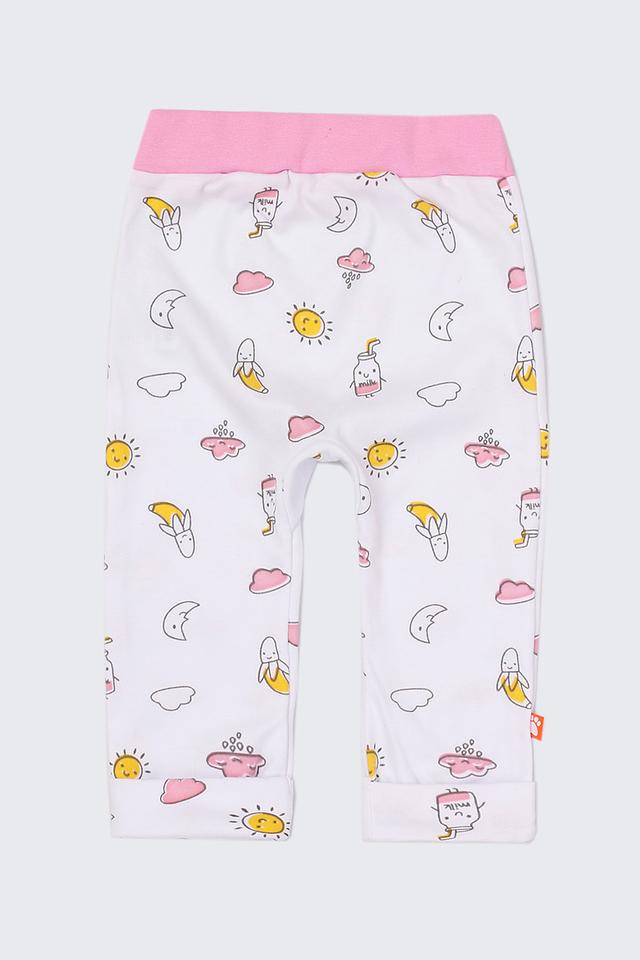 Брюки имеют нежно-розовый цвет и украшены милым принтом в виде солнышек, облачков, бананов и стаканчиков с молоком. Эластичный пояс обеспечивает комфортную посадку и не стесняет движений. Манжеты на штанинах аккуратно оформлены.