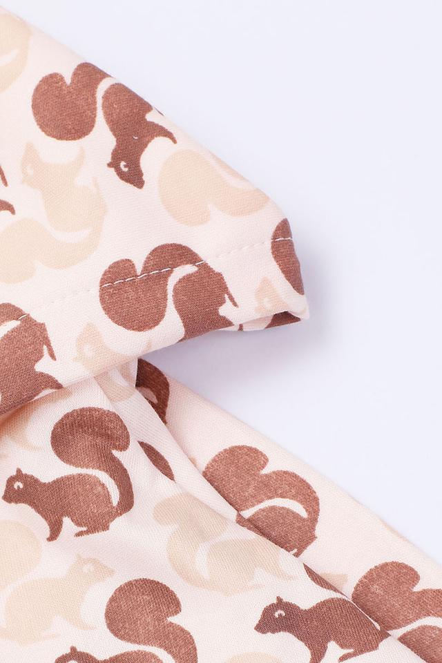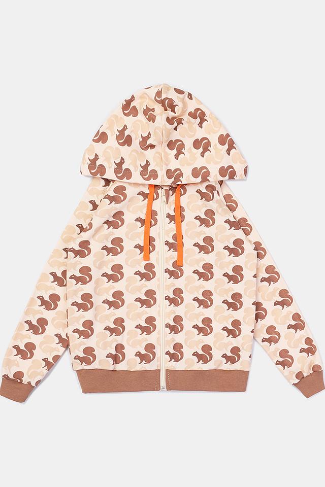 Кардиган имеет бежевый цвет и украшен милым принтом с изображением белок. Застёжка-молния позволяет легко надевать и снимать кардиган, а капюшон защитит от ветра и прохлады.