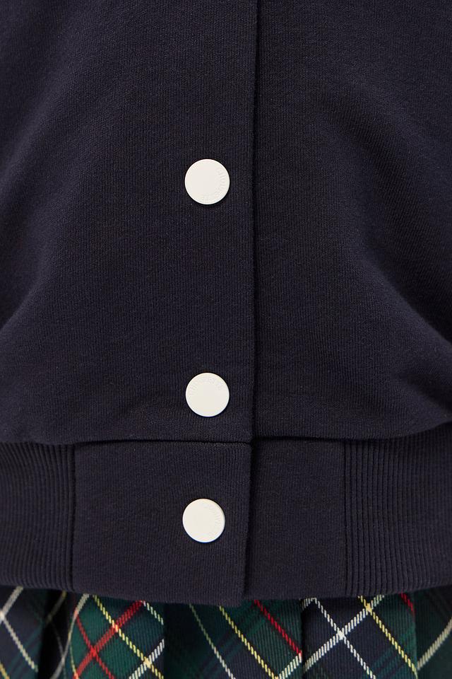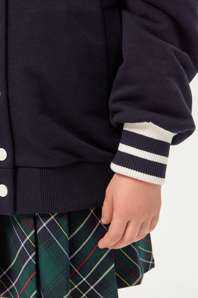 Куртка изготовлена из высококачественного хлопка (90%) с добавлением полиэстера (10%), что обеспечивает мягкость, удобство и практичность в носке. Застежка на пуговицах позволяет легко надевать и снимать куртку. Декоративные полосы в белую полоску на манжетах рукавов и воротнике придают модели особый шарм и спортивный вид.