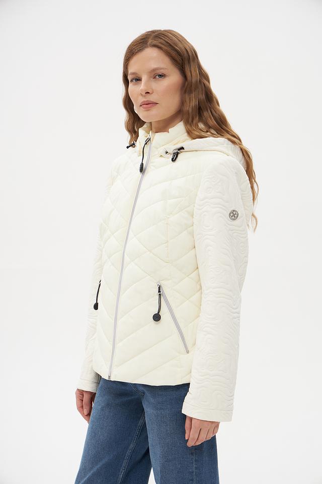 Куртка имеет застежку-молнию, боковые карманы и декоративные элементы на рукавах. Рукава куртки выполнены из текстурированной ткани с геометрическим рисунком, что придает ей оригинальность.