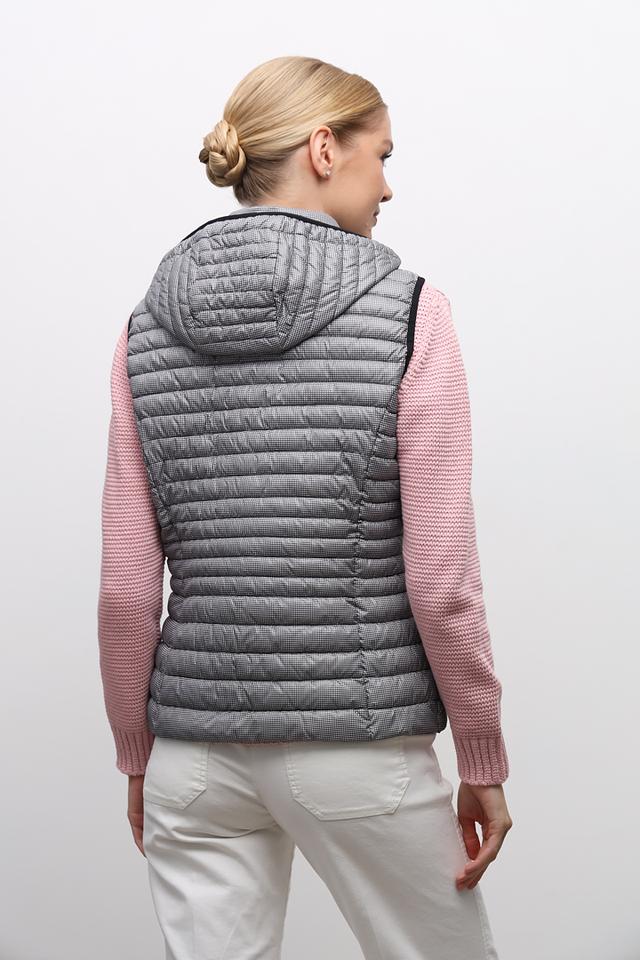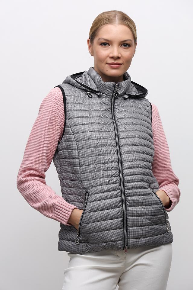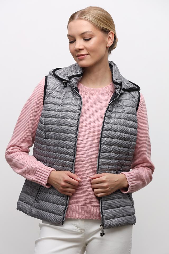 Стильный жилет Lebek серого цвета с узором "гусиная лапка" станет отличным дополнением к вашему гардеробу. Удобный крой и капюшон обеспечивают комфорт в прохладную погоду. Состав: полиэстер 100%