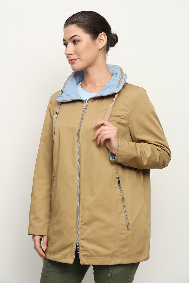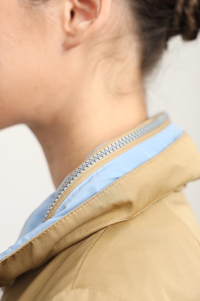 Плащ имеет прямой крой, капюшон и застёжку на молнии. Отличительной особенностью модели является двухцветное исполнение: голубой снаружи и бежевый внутри.