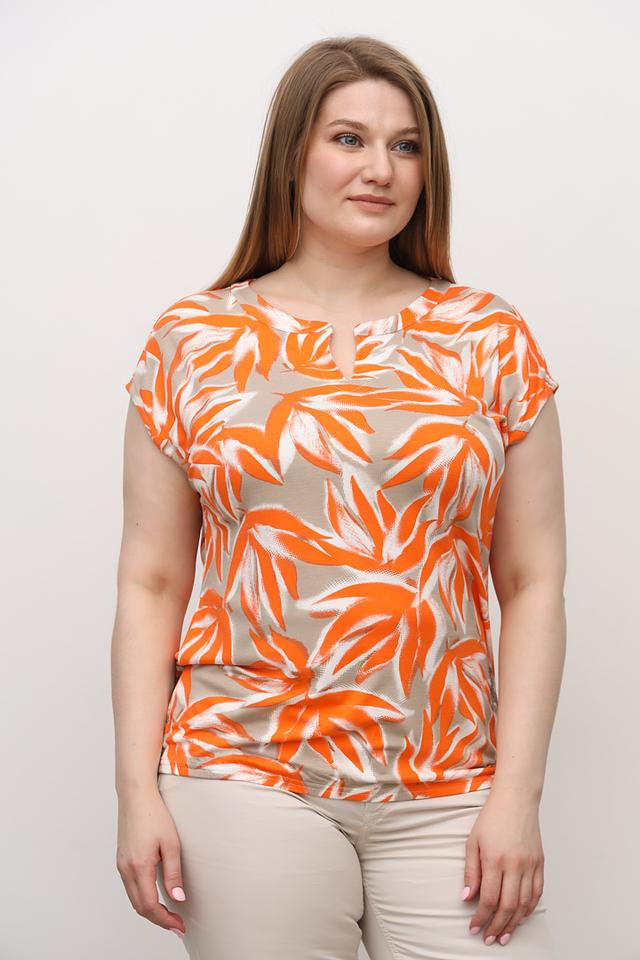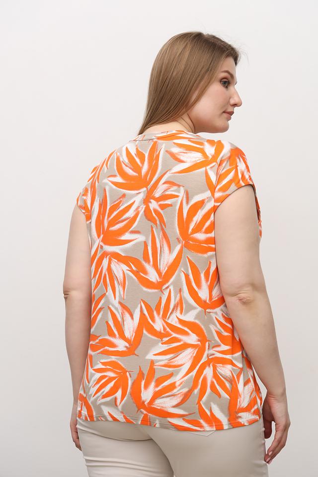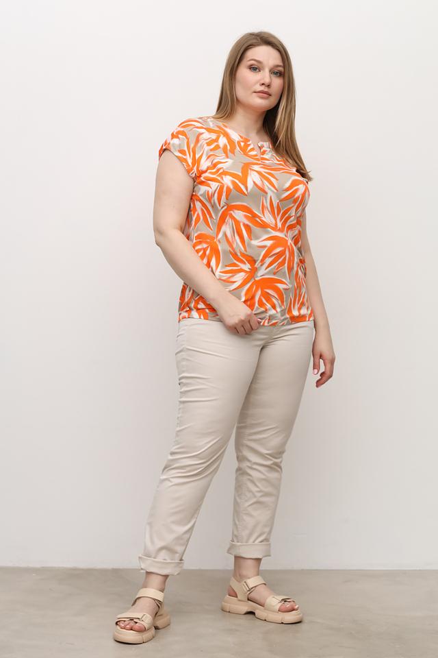 Футболка имеет прямой крой и короткие рукава. V-образный вырез горловины придает образу женственность. Главная особенность модели – яркий и эффектный цветочный принт, выполненный в оранжевых и белых тонах на бежевом фоне.