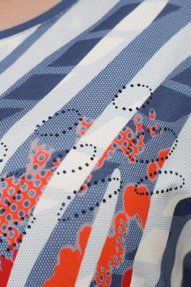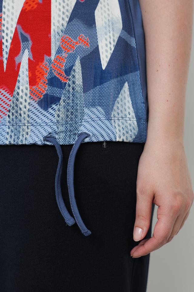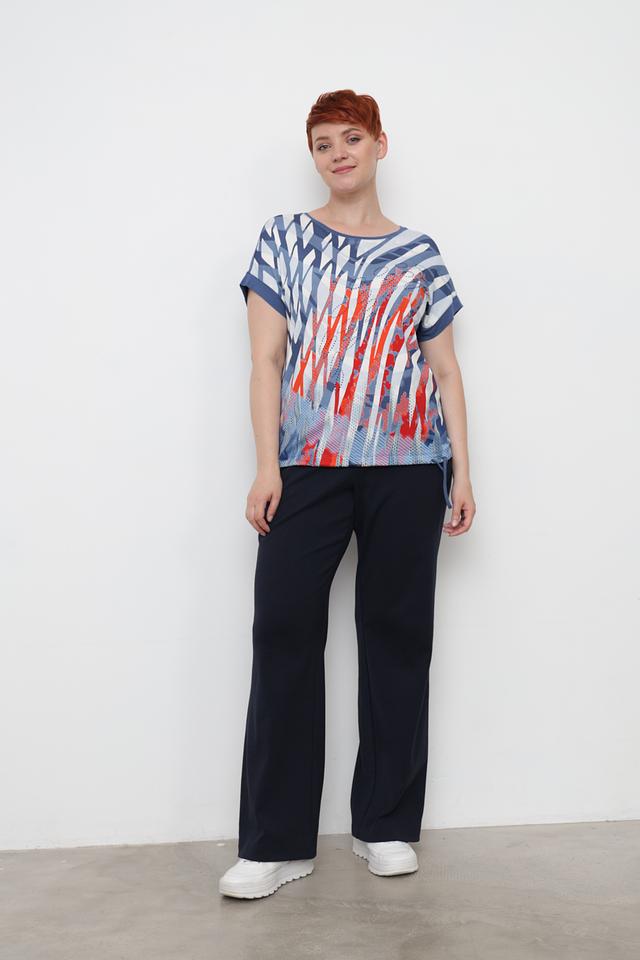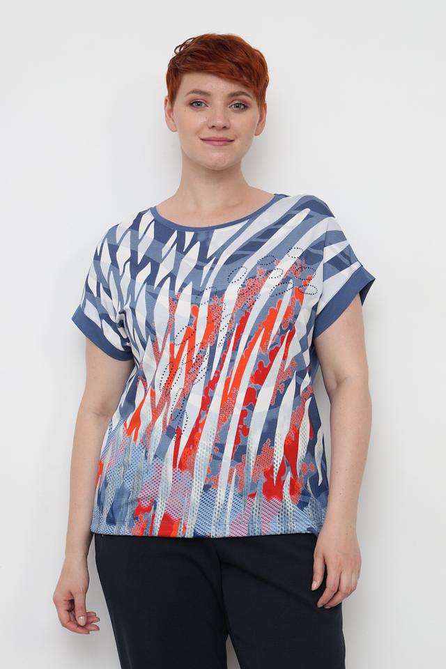 Футболка имеет свободный крой, который не сковывает движений, и короткие рукава, идеально подходящие для теплой погоды. Главной особенностью модели является яркий и оригинальный абстрактный принт, выполненный в сочетании голубого, белого и красного цветов.
