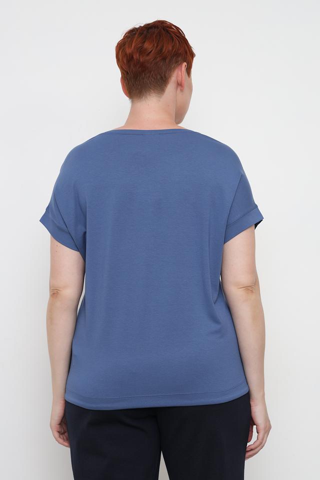 Женская футболка Barbara Lebek голубого цвета с ярким абстрактным принтом. Модель выполнена из мягкой вискозы с добавлением эластана, обеспечивающего комфортную посадку. Футболка имеет свободный крой и короткие рукава. Состав: вискоза 92%, эластан 8%