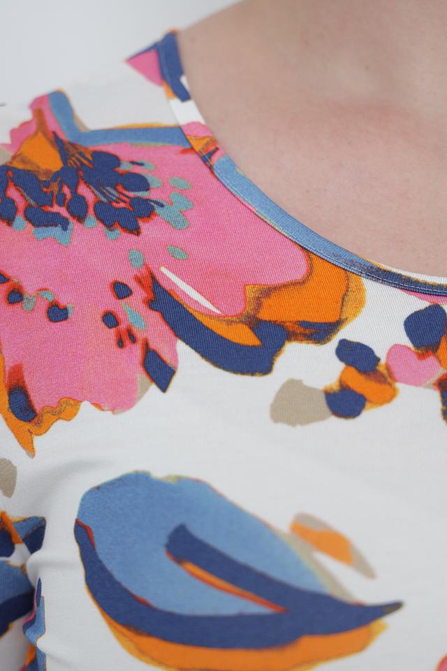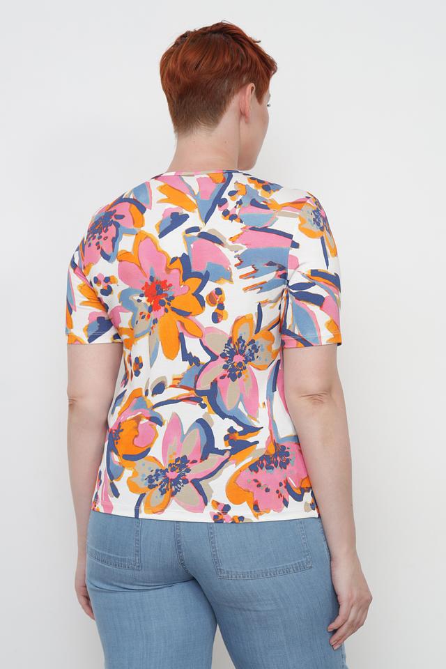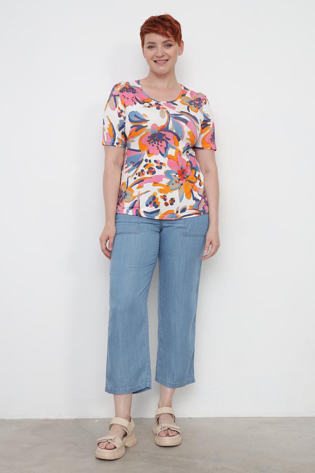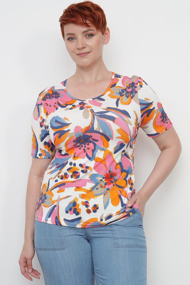 Основной цвет футболки – белый, а украшает ее красочный цветочный принт, выполненный в оранжевых, розовых, голубых и синих тонах. Круглый вырез горловины и короткие рукава делают эту модель универсальной и подходящей для различных случаев.