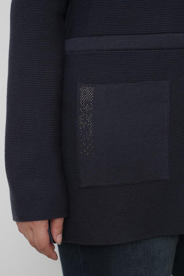 Модель имеет удобную застежку-молнию, два накладных кармана и воротник-стойку. Фактурный трикотаж придает жакету оригинальный вид.