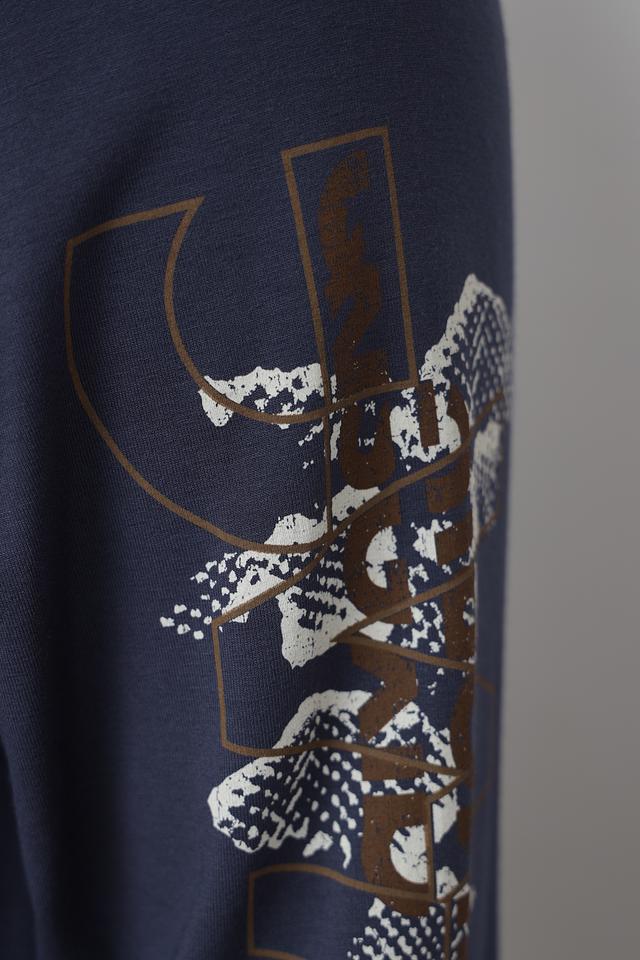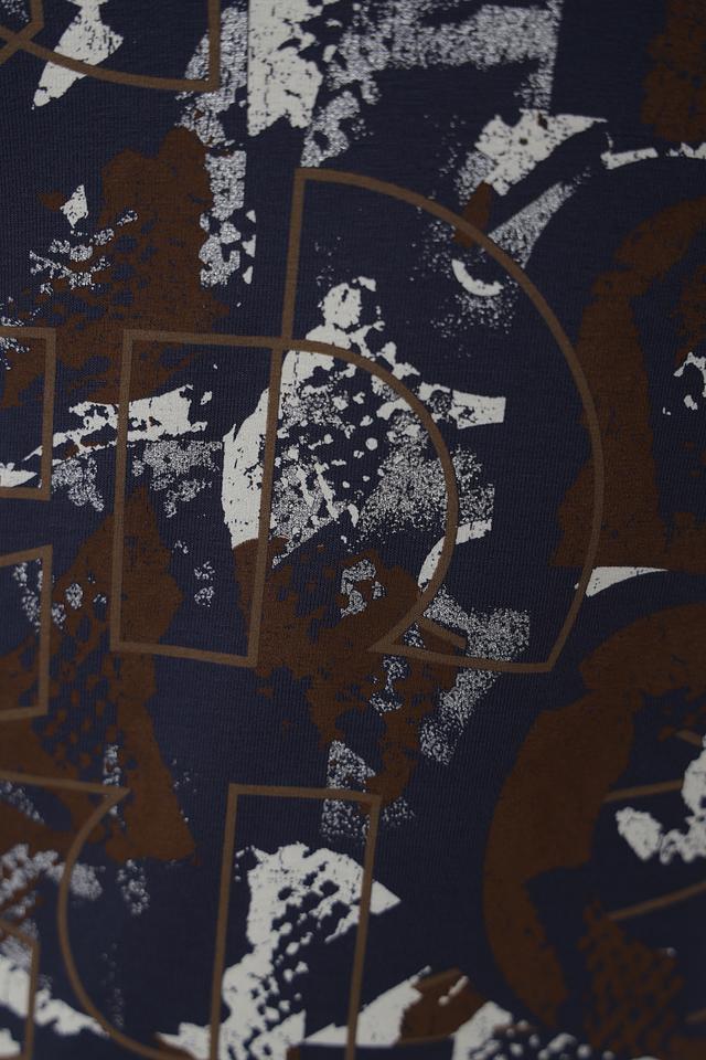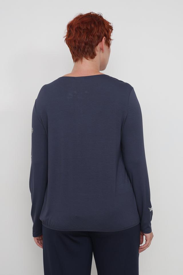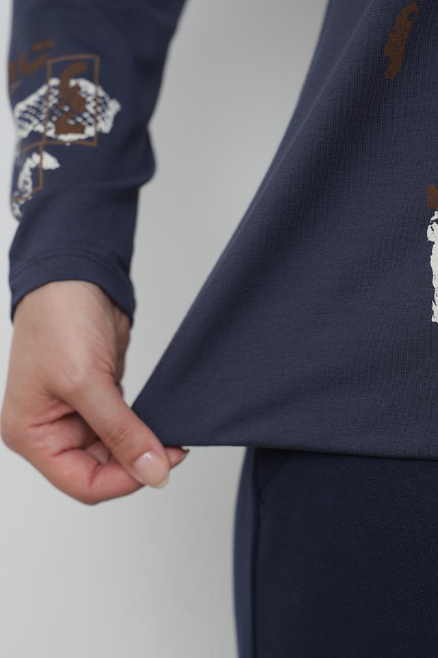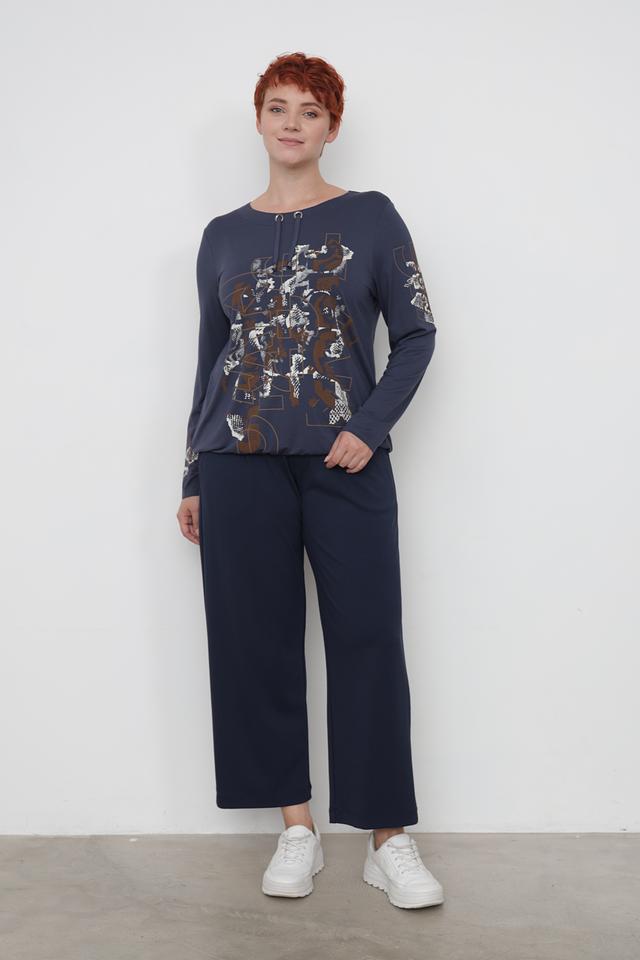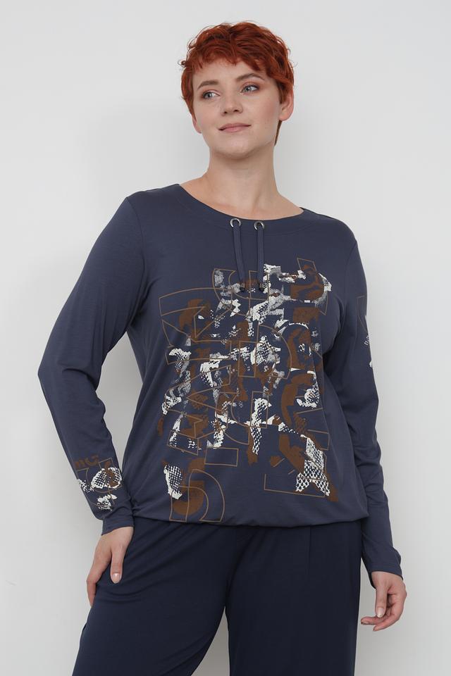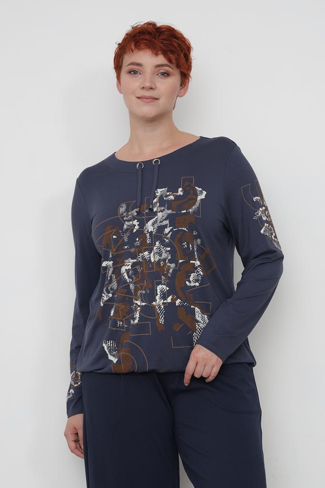 Лонгслив имеет насыщенный синий цвет и украшен ярким, абстрактным принтом, выполненным в коричневых и белых тонах. Вырез горловины дополнен декоративными шнурками, которые придают модели оригинальность.