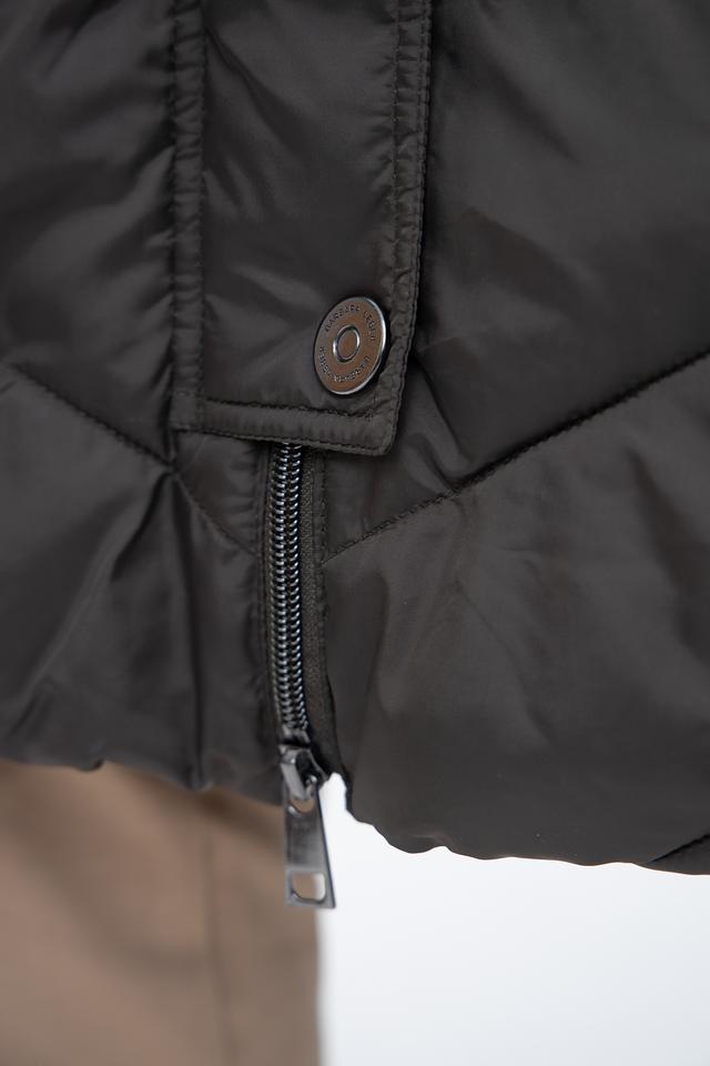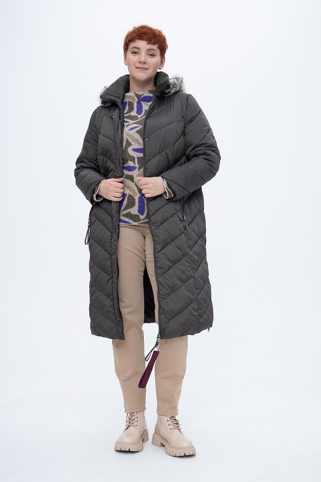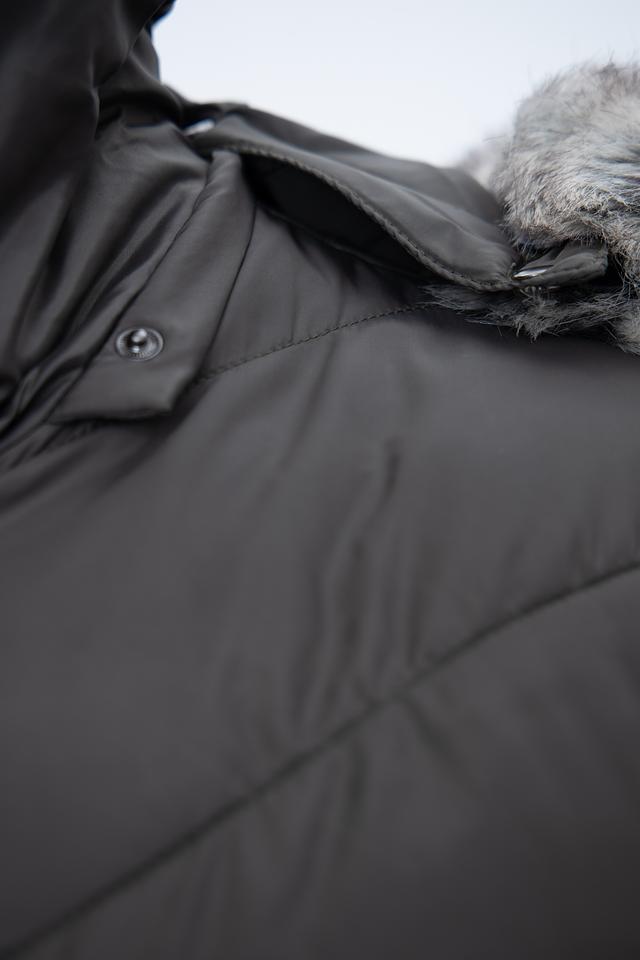 Пальто имеет стеганую фактуру, которая придает ему современный вид. Капюшон отделан искусственным мехом, что делает его не только функциональным, но и декоративным элементом. Застежка – молния, дополненная ветрозащитной планкой на кнопках.