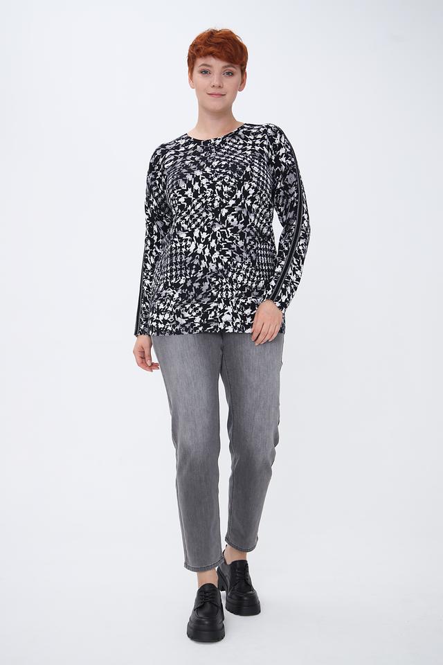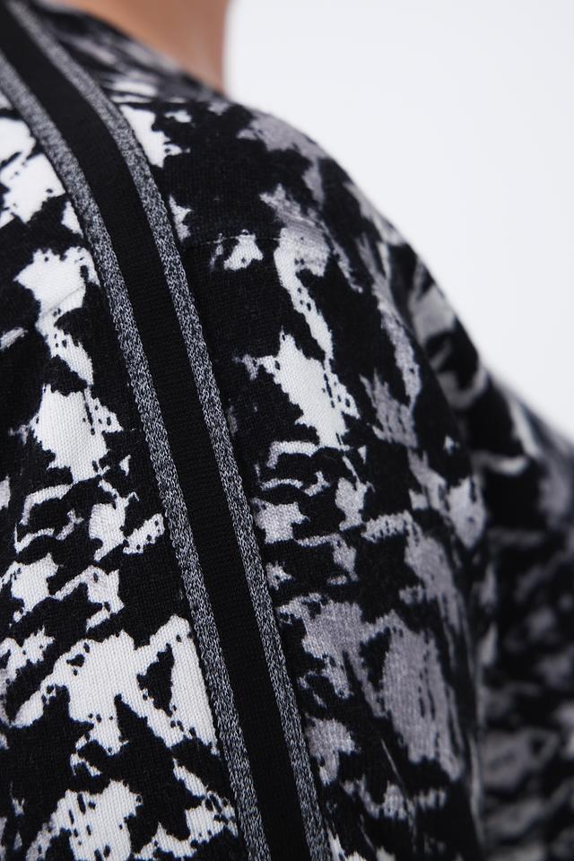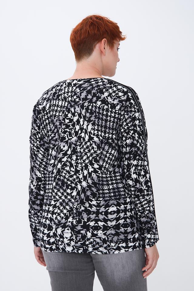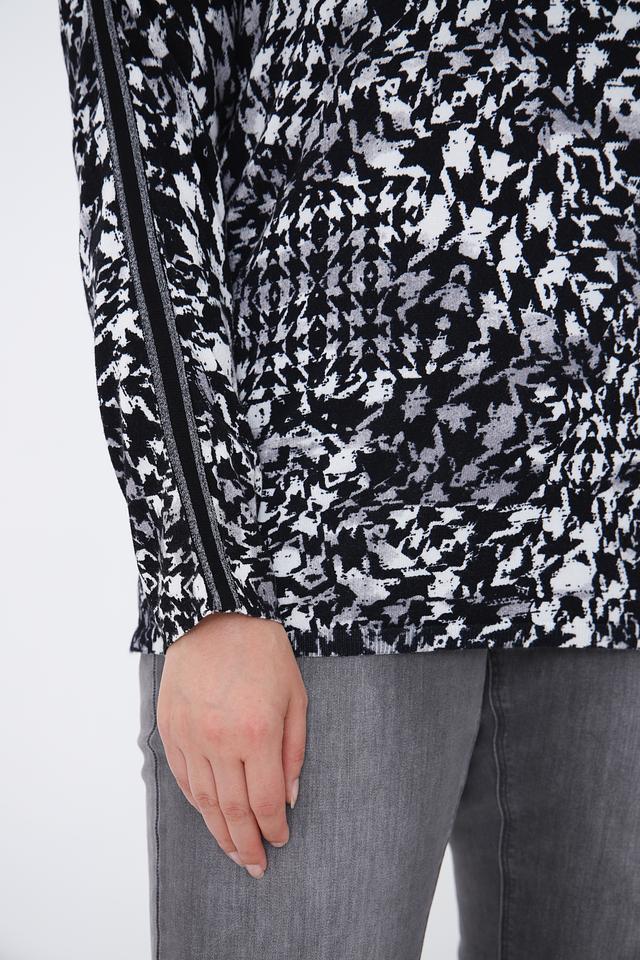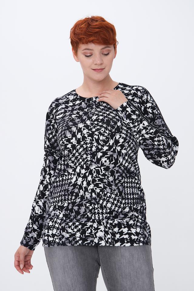 Женский пуловер Barbara Lebek чёрно-белого цвета с абстрактным принтом и полосками на рукавах. Модель выполнена из мягкой вискозы, обеспечивающей комфорт в носке. Состав: вискоза 69%, полиамид 30%, метализ.нить 1%