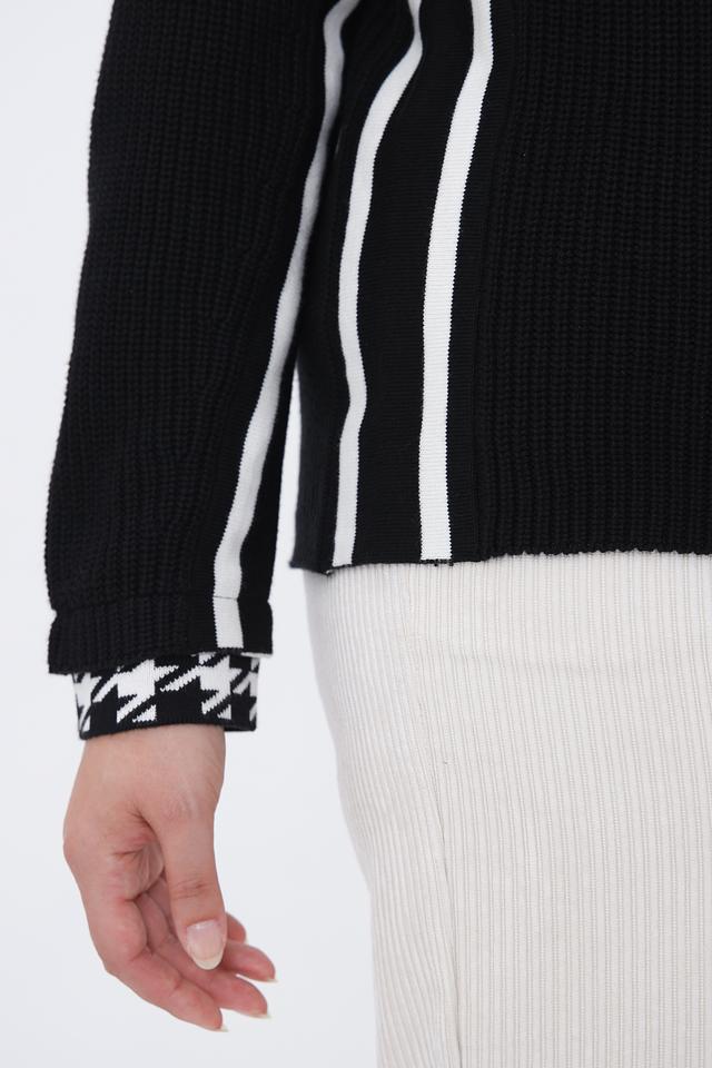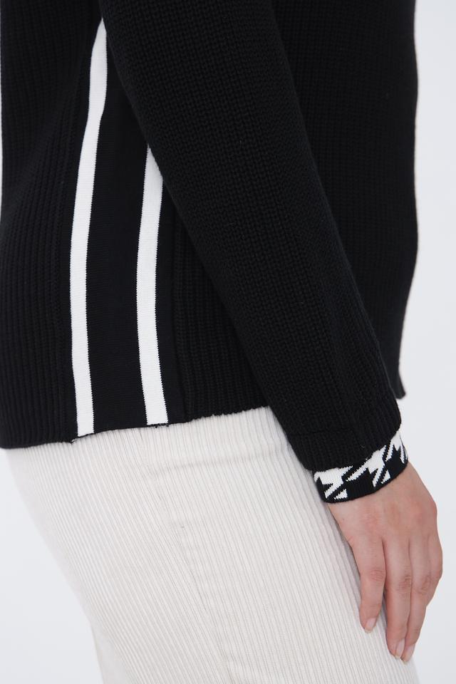 Особенностью модели являются контрастные белые полоски, расположенные на рукавах и по бокам изделия. Это придает пуловеру динамичный и современный вид. Ткань пуловера состоит из 50% хлопка и 50% полиакрила, что обеспечивает мягкость, тепло и долговечность.