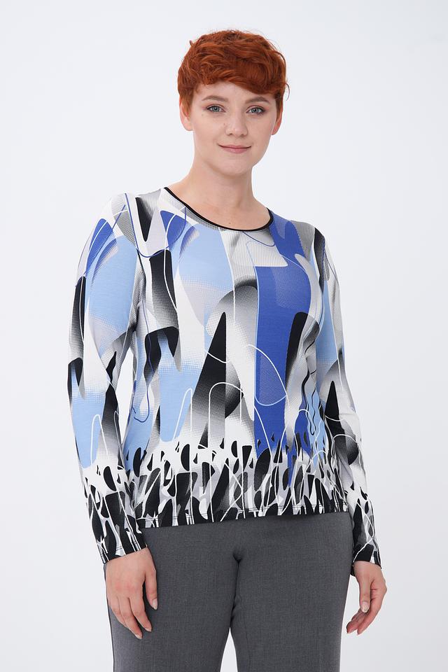 Модель имеет длинные рукава и круглый вырез горловины. Главная особенность – яркий и необычный абстрактный принт, сочетающий в себе оттенки голубого, серого, белого и черного.