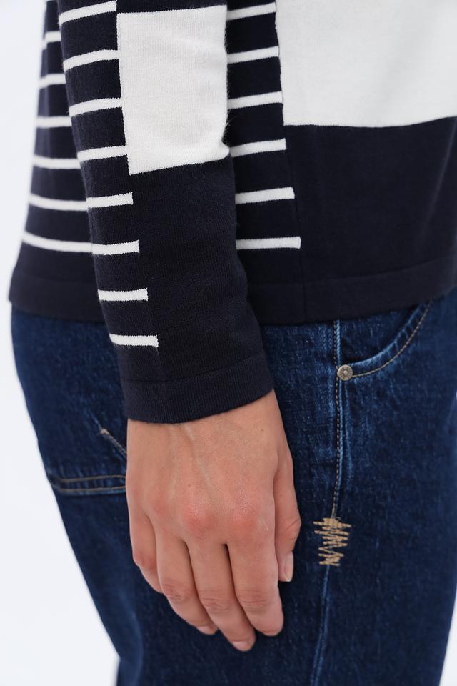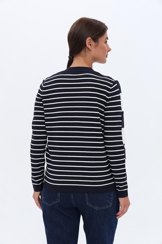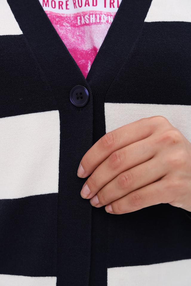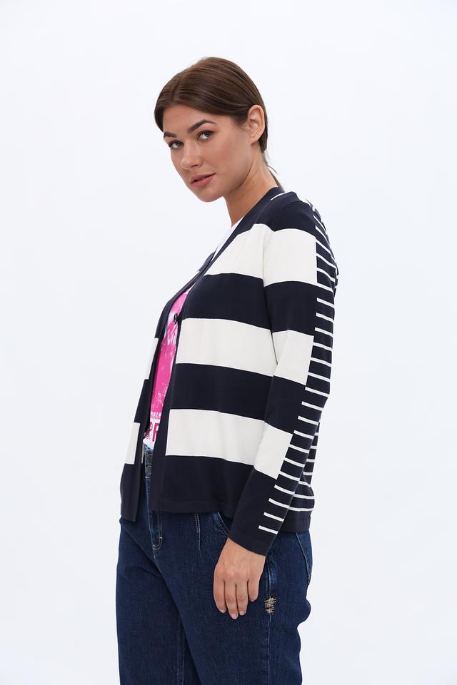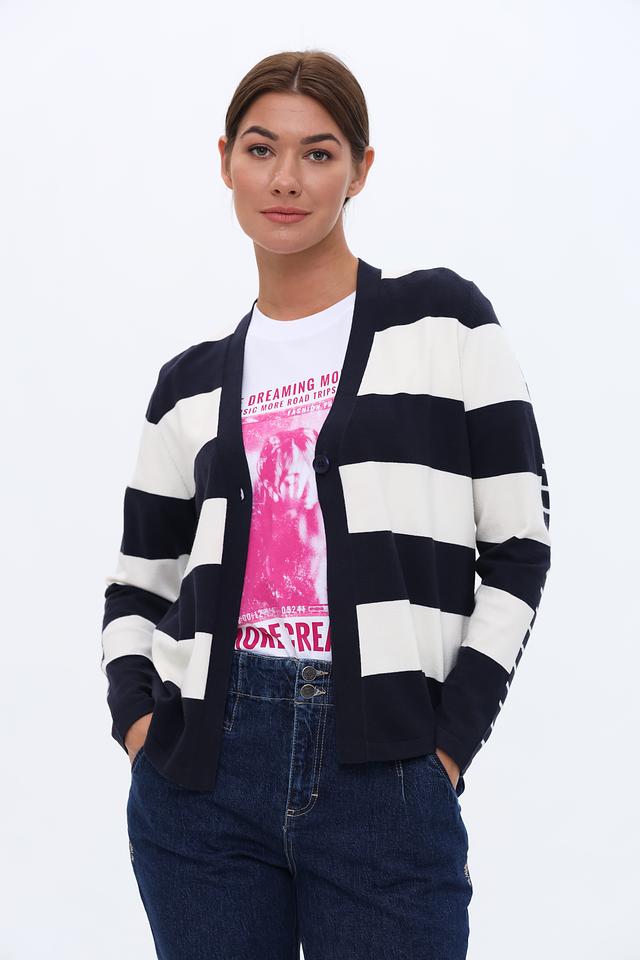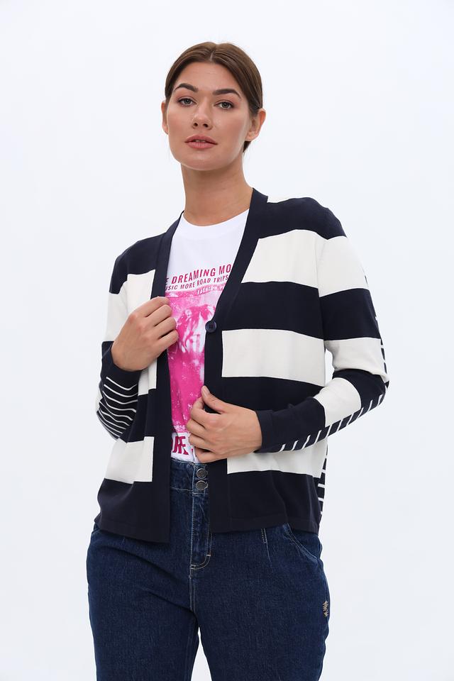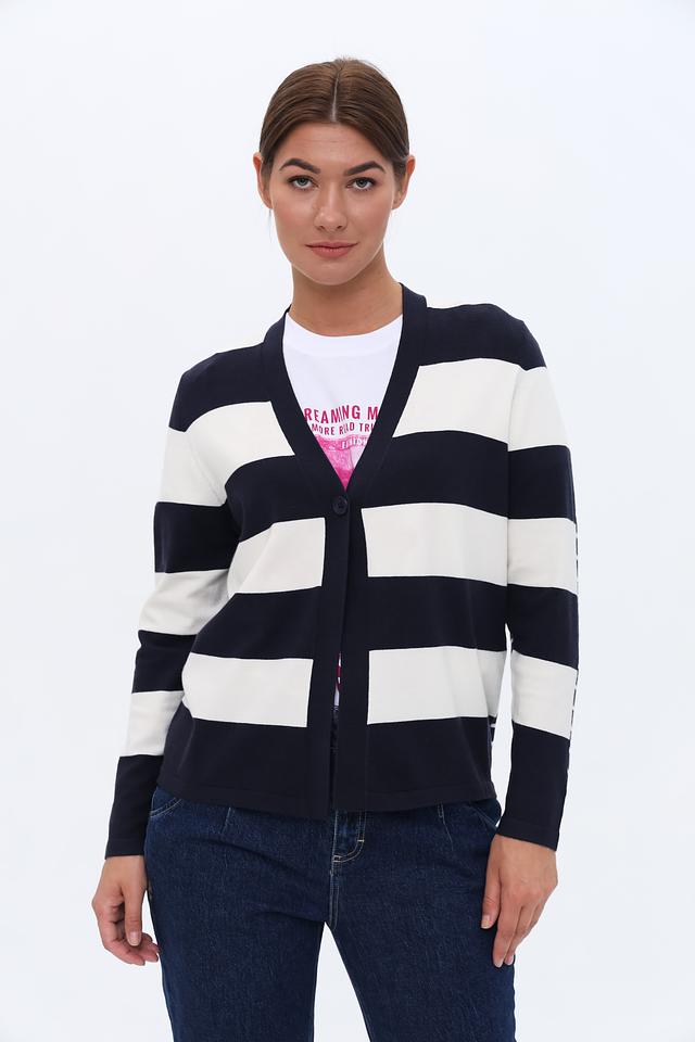 Кардиган имеет классический крой и оформлен в сине-белую полоску, что делает его универсальным и легко сочетаемым с различными элементами одежды. Длинные рукава и застежка на пуговицы позволяют регулировать степень тепла и создавать разные образы.