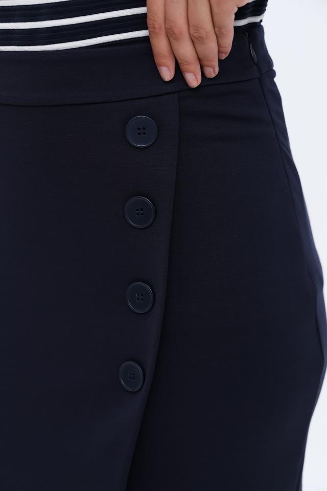 Юбка Barbara Lebek темно-синего цвета – элегантная модель с асимметричным кроем и декоративными пуговицами. Идеально подходит для создания стильных образов в офисе и на каждый день. Состав: вискоза 70%, полиамид 25%, эластан 5%