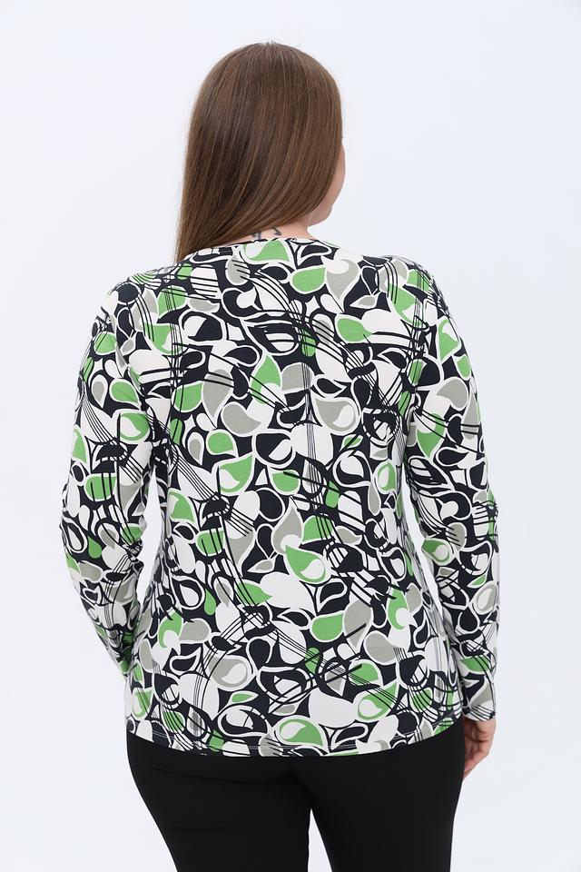 Лонгслив имеет оригинальный абстрактный принт, сочетающий в себе зеленые, черные и серые оттенки. Круглый вырез горловины и длинные рукава делают его универсальным для различных образов.
