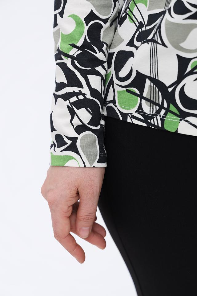 Женский лонгслив Lebek зеленого, черного и серого цветов с оригинальным абстрактным принтом. Изготовлен из мягкой и приятной к телу вискозы с добавлением эластана для комфортной посадки. Состав: вискоза 92%, эластан 8%