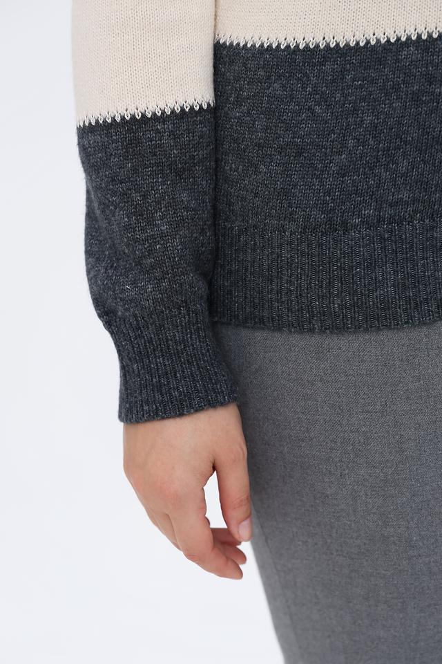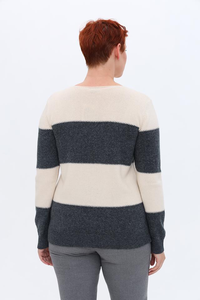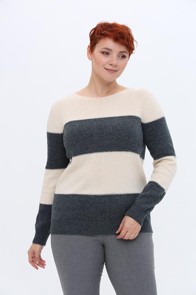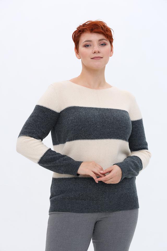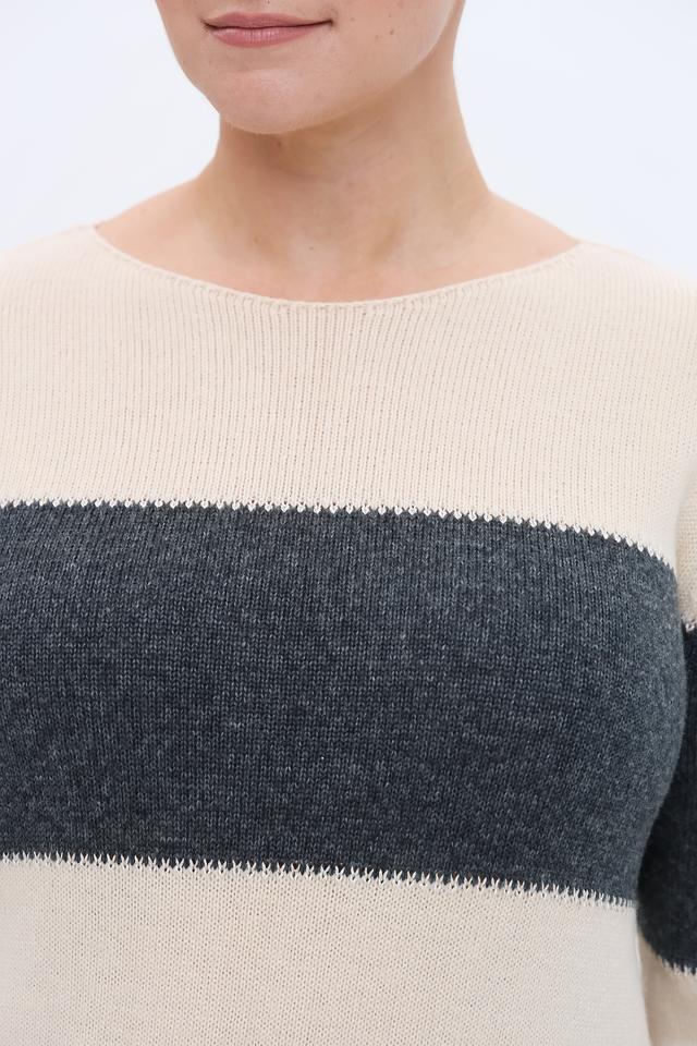 Женский пуловер Lebek бежевого и серого цвета с полосками. Модель выполнена из мягкого трикотажа с добавлением шерсти, имеет округлый вырез горловины и длинные рукава. Состав: полиамид 43%, полиакрил 39%, шерсть 18%