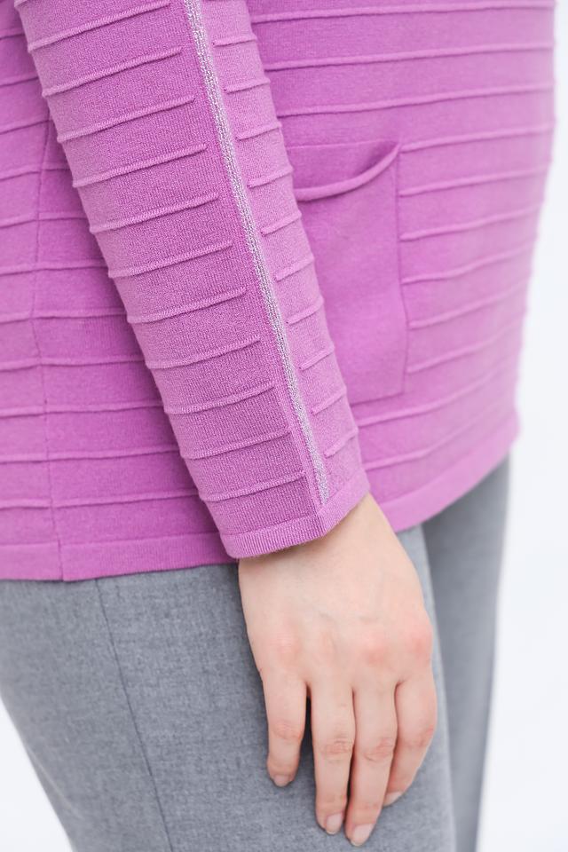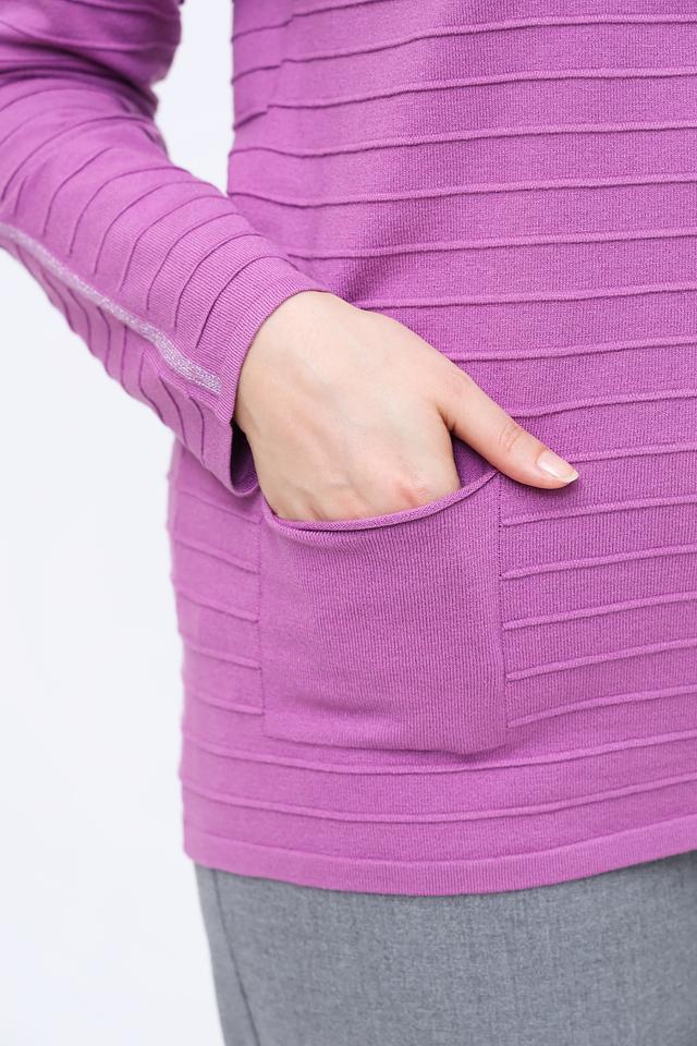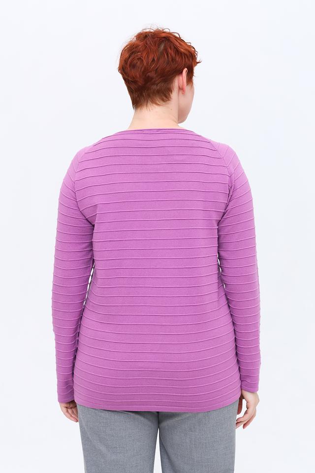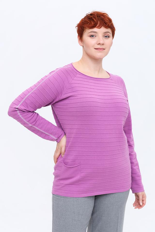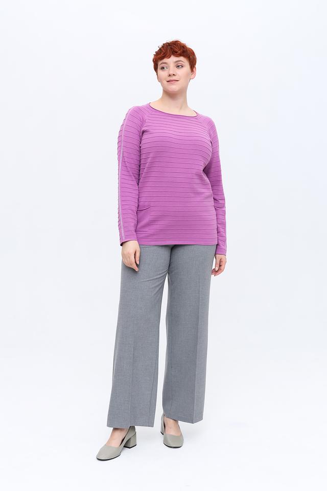 Пуловер имеет лавандовый цвет и украшен горизонтальными полосками, которые визуально вытягивают силуэт. Декоративная полоса на рукавах добавляет изысканности образу. Круглый вырез горловины и свободный крой обеспечивают комфортную посадку по фигуре.