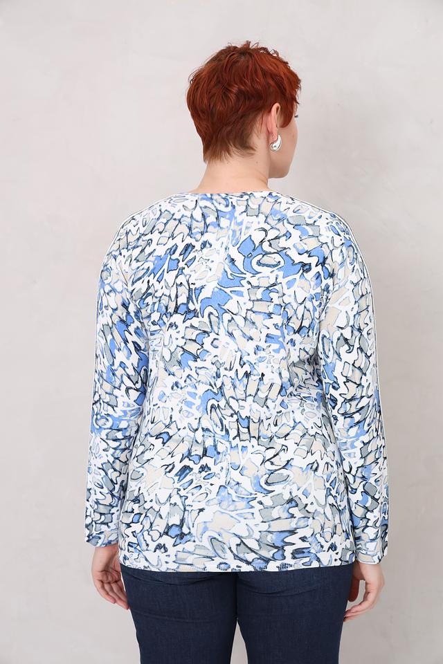 Женский пуловер Lebek голубого цвета с оригинальным абстрактным рисунком и полосками на рукавах. Изготовлен из мягкой вискозы с добавлением полиамида для сохранения формы. Стильный и комфортный выбор для повседневного образа. Состав: вискоза 69%, полиамид 30%, метализ.нить 1%