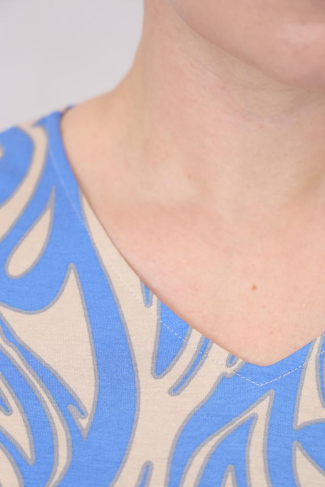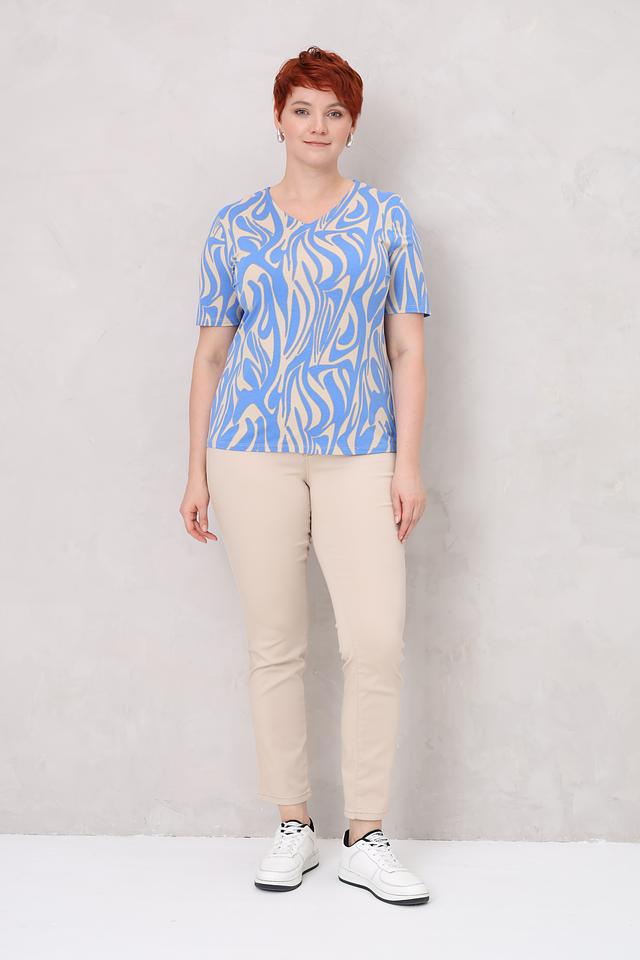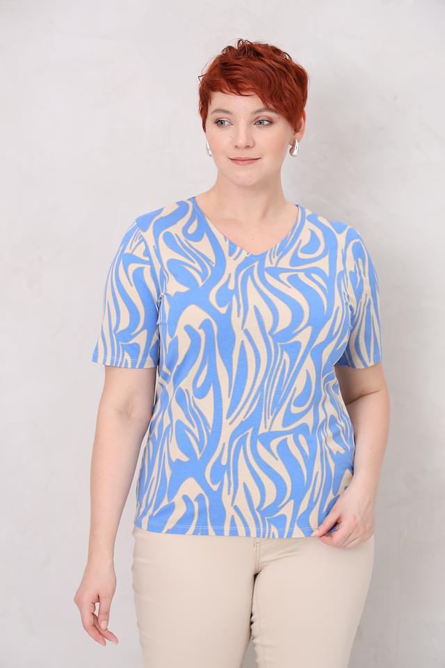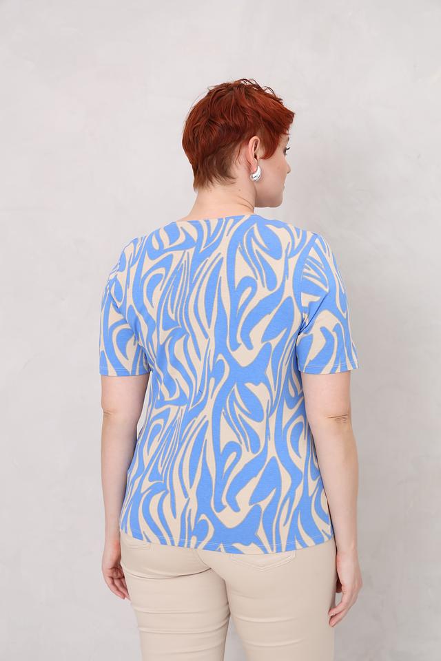 Особенностью данной модели является яркий и необычный принт в голубых и бежевых тонах, который добавит вашему образу индивидуальности и стиля. Футболка идеально сочетается с джинсами, брюками или юбками, позволяя создавать разнообразные образы для повседневной жизни.