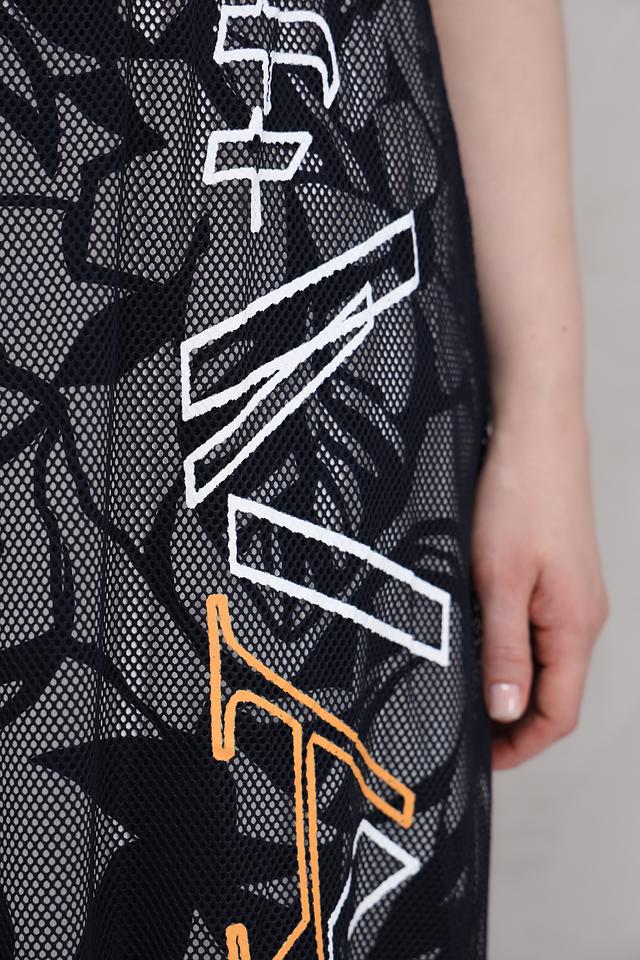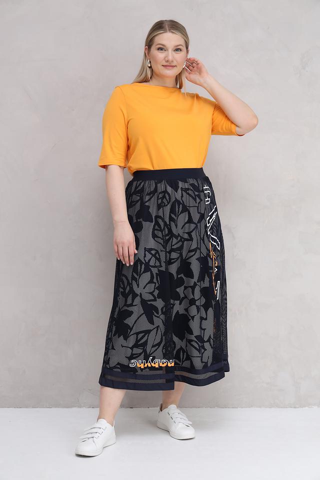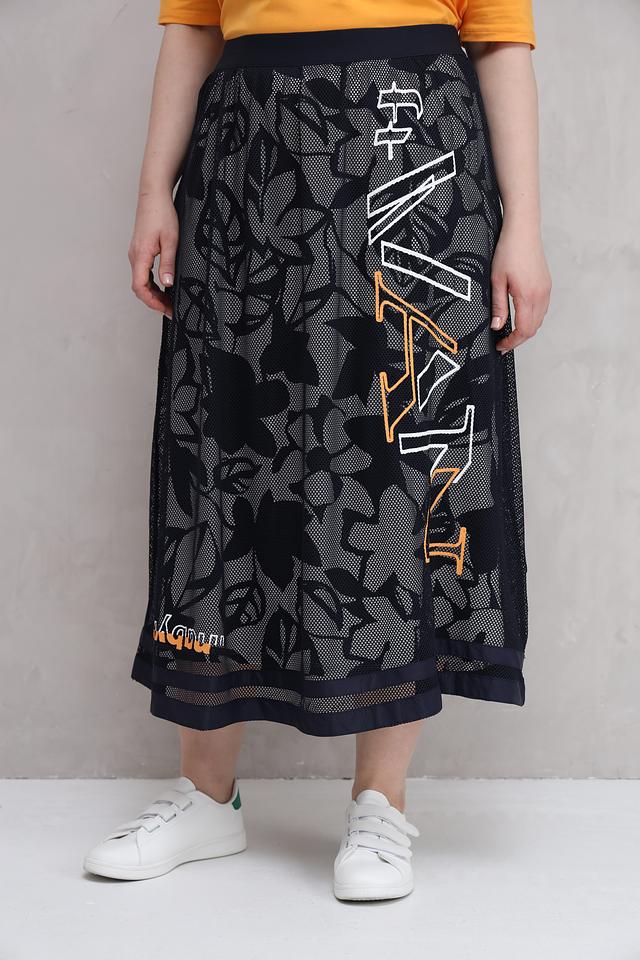 Юбка Barbara Lebek темно-синего цвета с оригинальным цветочным принтом и надписью. Модель выполнена из полиэстера и имеет длину миди, что делает ее универсальным элементом гардероба. Состав: полиэстер 100%