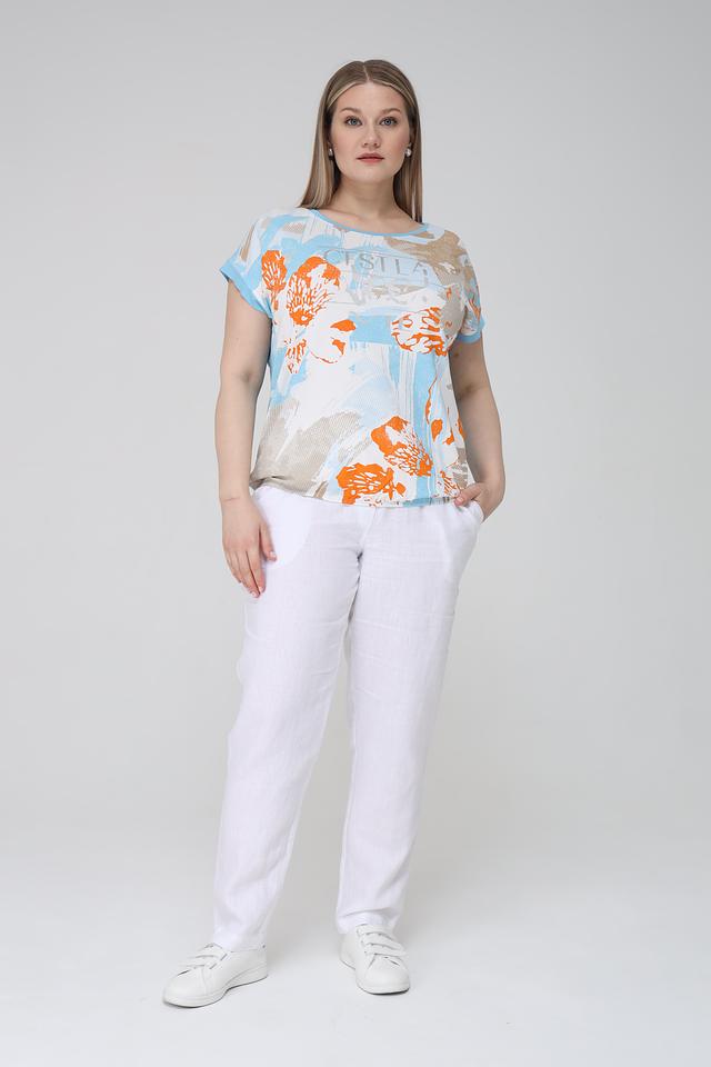 Женская футболка Lebek светло-голубого цвета с ярким абстрактным принтом оранжевого и бежевого оттенков. Модель выполнена из мягкой вискозы с добавлением эластана для комфортной посадки и свободы движений. Состав: вискоза 92%, эластан 8%