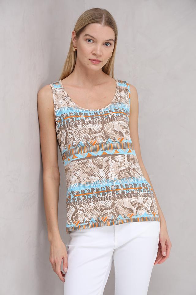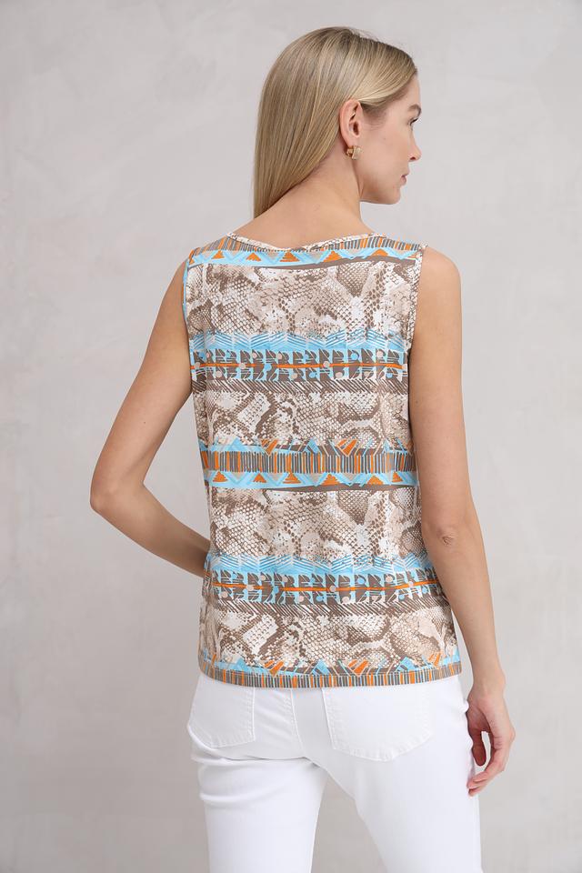 Особенностью данной модели является яркий и необычный принт, имитирующий кожу рептилии, выполненный в бежевых, оранжевых и голубых тонах. Вырез горловины округлый, а бретели тонкие. Топ идеально сочетается с джинсами, брюками или юбками, позволяя создавать разнообразные стильные комплекты.