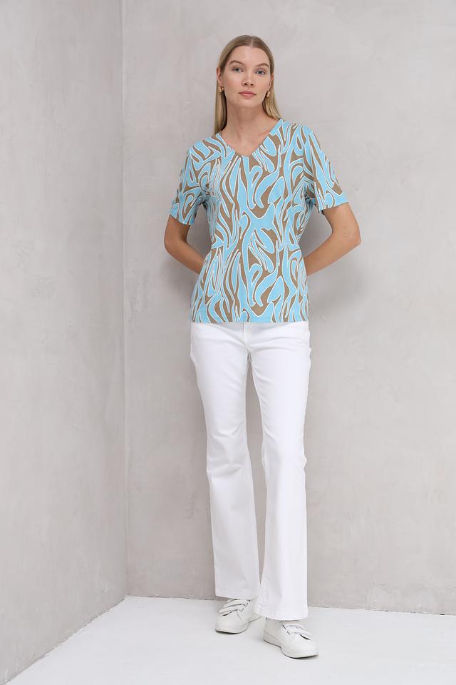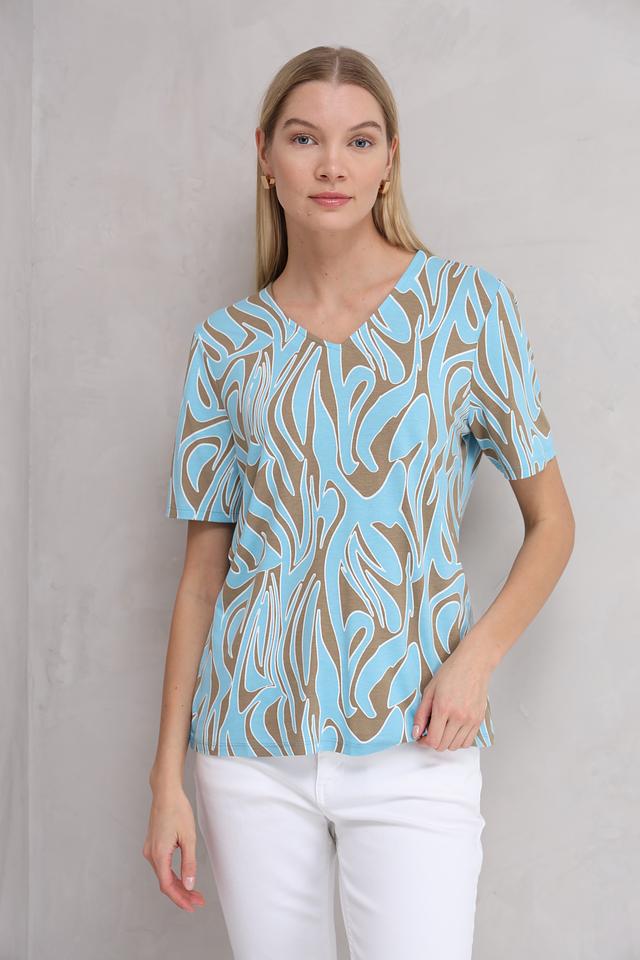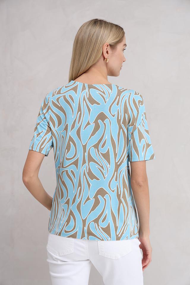 Особенностью данной модели является яркий и необычный принт в абстрактном стиле, выполненный в сочетании голубого и коричневого цветов. Этот принт добавит вашему образу оригинальности и индивидуальности.