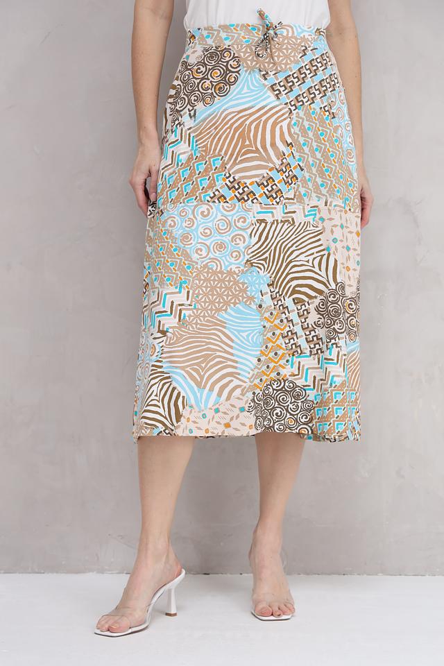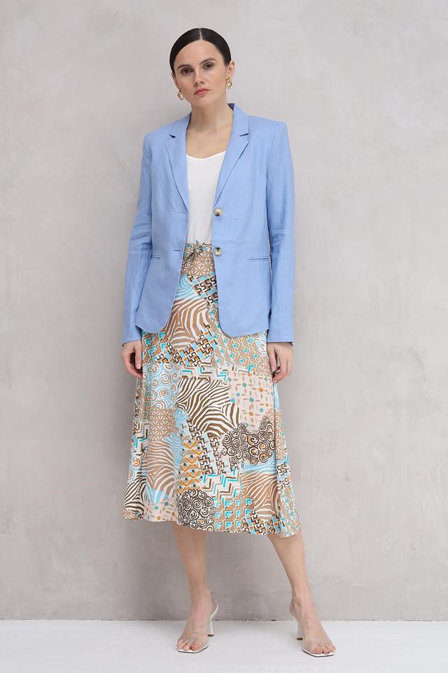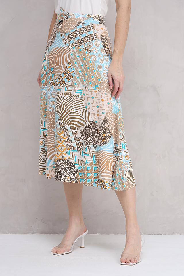 Юбка имеет длину миди и свободный крой, что делает ее универсальной для различных типов фигуры. Особенностью модели является оригинальный принт, сочетающий в себе различные геометрические узоры и оттенки.