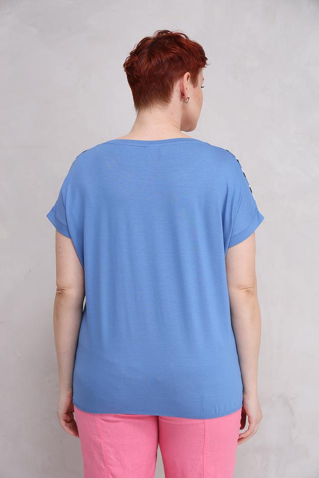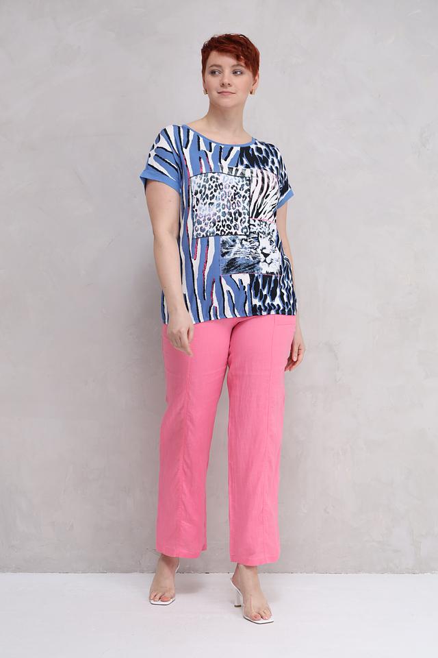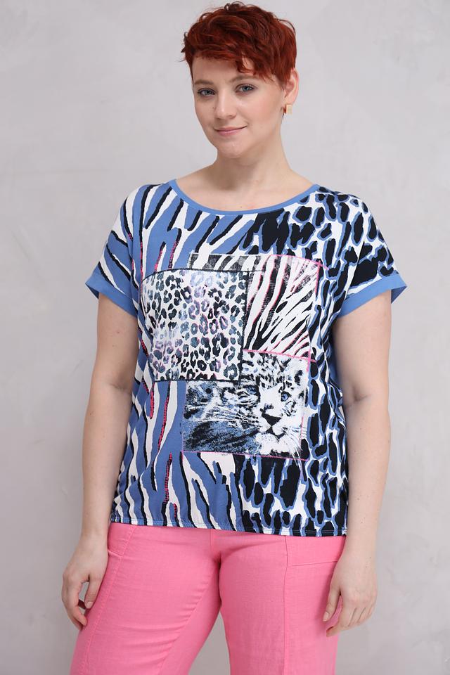 Женская футболка Lebek голубого цвета с ярким принтом в виде зебры и леопарда. Модель свободного кроя с короткими рукавами, выполнена из мягкой и приятной к телу вискозы с добавлением эластана. Состав: вискоза 95%, эластан 5%