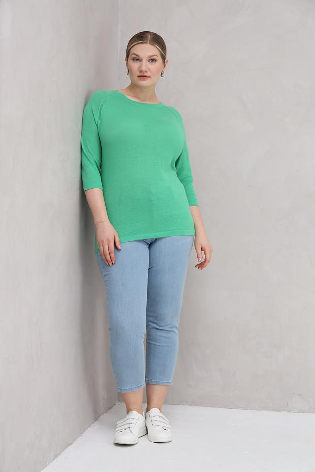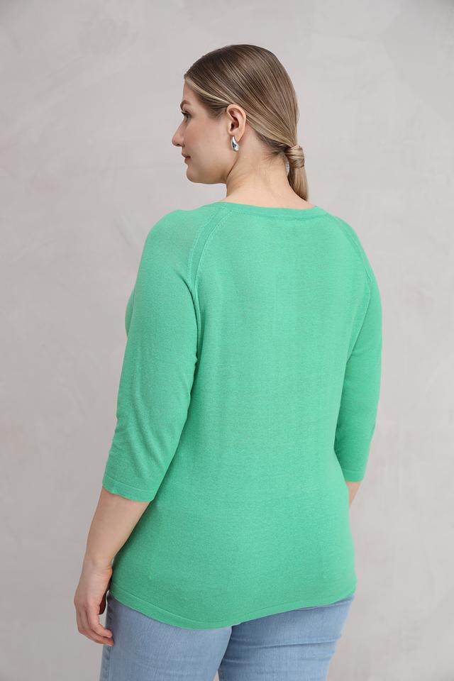 Модель имеет удобный крой, который не сковывает движения. Рукав 3/4 делает этот пуловер универсальным для любого времени года. Вырез горловины классический, округлый.