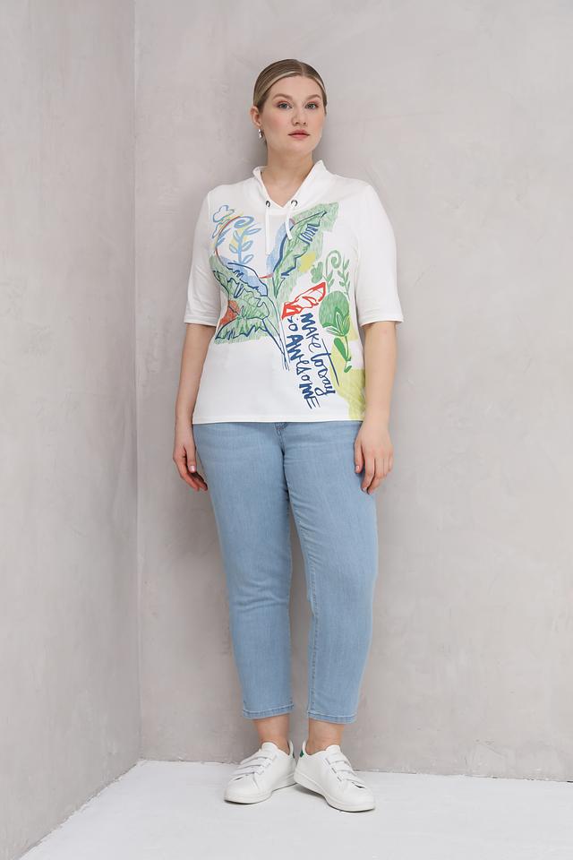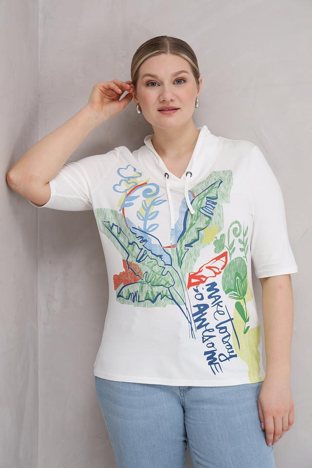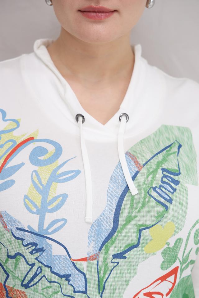 Основной цвет футболки – белый, который служит идеальным фоном для яркого и красочного цветочного принта. Принт выполнен в различных оттенках зеленого, голубого, красного и желтого, создавая позитивное и жизнерадостное настроение.