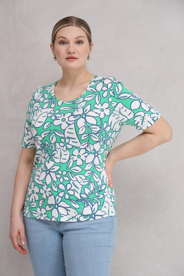 Женская футболка Lebek мятного цвета с ярким цветочным принтом станет отличным дополнением к вашему гардеробу. Модель выполнена из мягкой вискозы с добавлением эластана, обеспечивая комфорт и свободу движений. Состав: вискоза 95%, эластан 5%