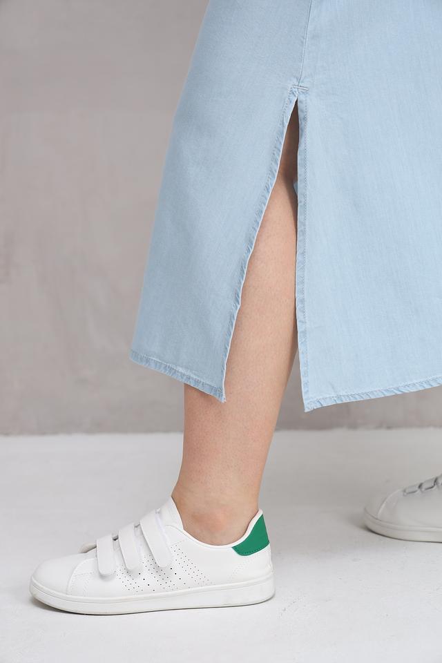 Юбка имеет классический крой и длину миди, что делает ее универсальной для разных случаев. Небольшой разрез спереди добавляет образу легкости и динамики. Застежка на молнии и пуговице обеспечивает надежную посадку.