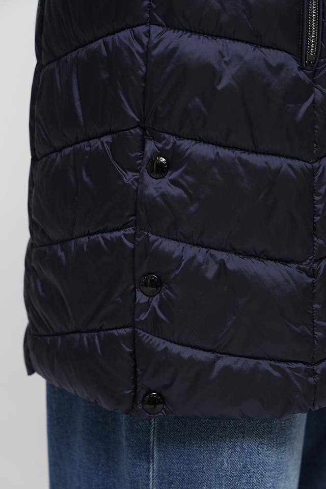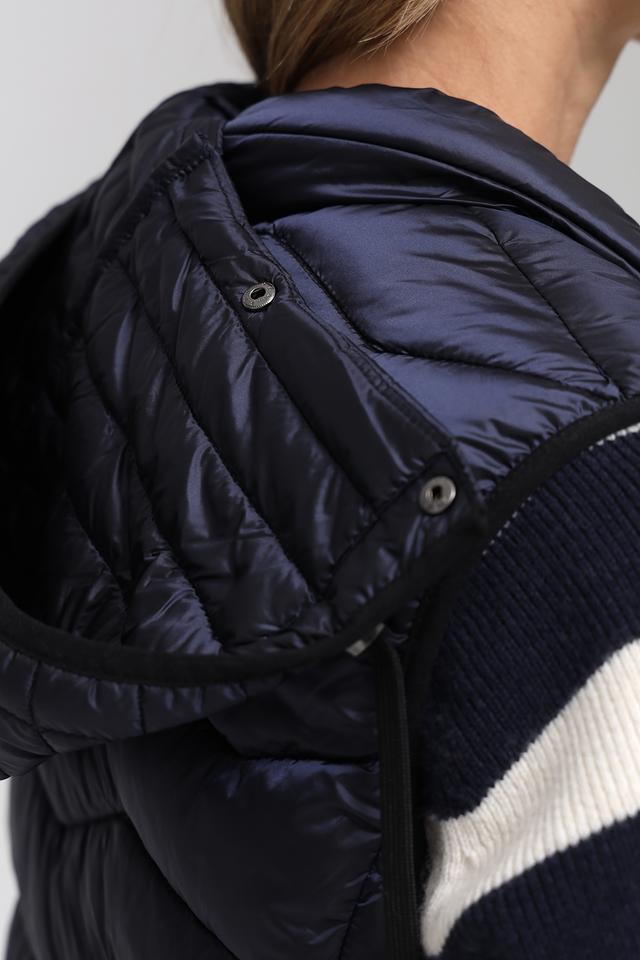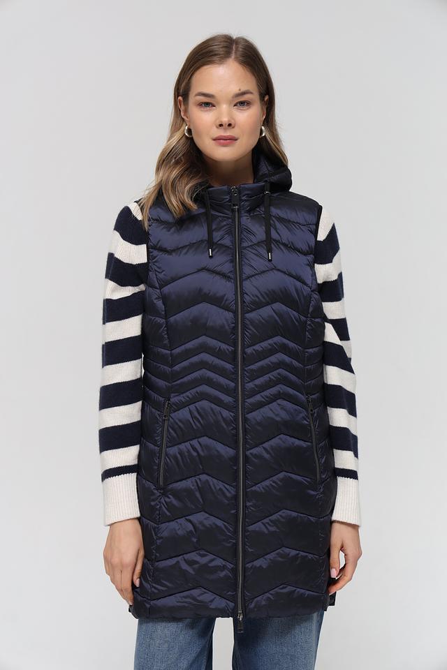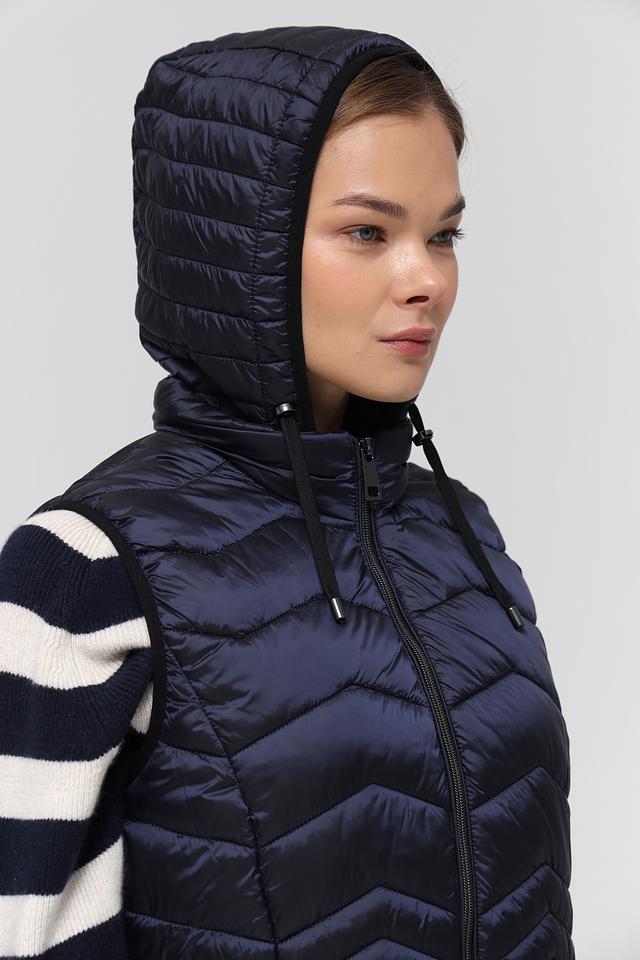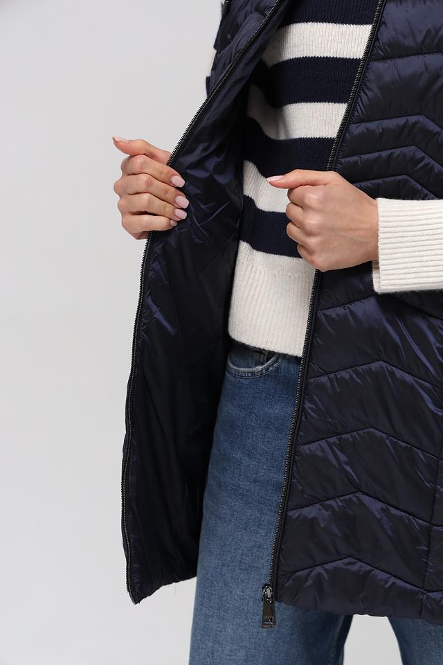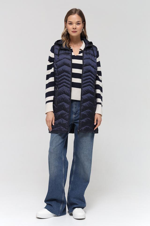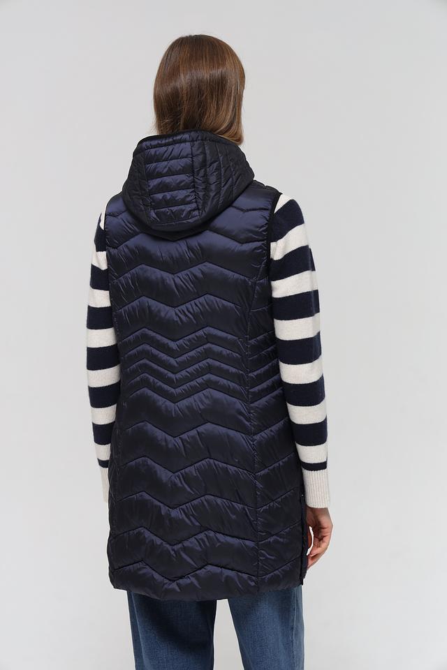 Жилет имеет удлиненный крой, который обеспечивает дополнительную защиту от холода. Стеганая текстура придает изделию современный вид. Капюшон регулируется шнурками, что позволяет подогнать его по размеру. Застежка-молния во всю длину обеспечивает удобство надевания и снятия.